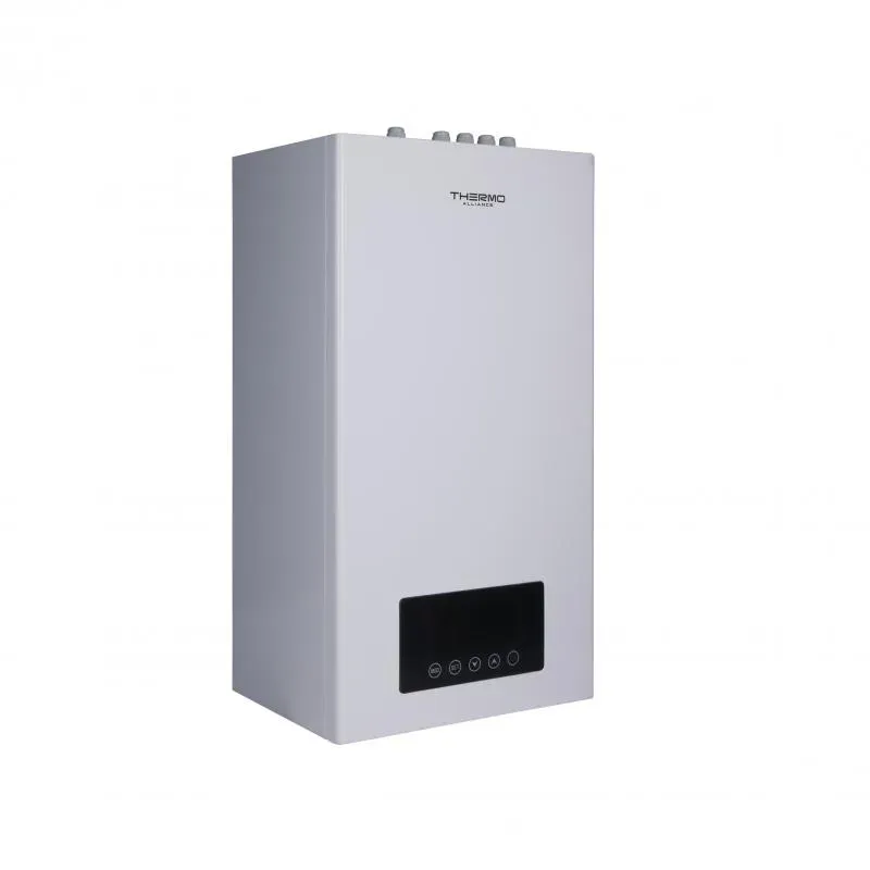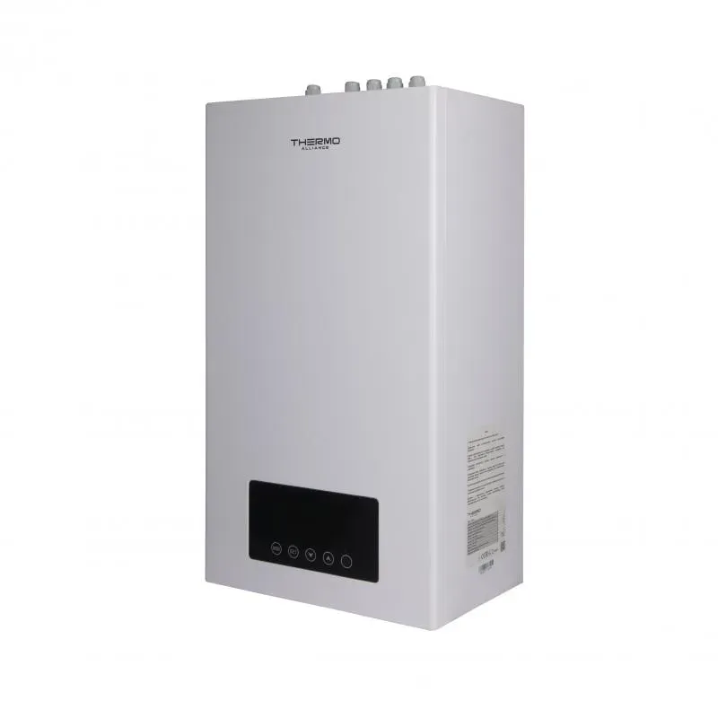Настінний електричний котел Thermo Alliance 12 кВт призначений для нагрівання опалювальної води із примусовою циркуляцією в системах опалення при надлишковому тиску води до 3,0 бар. Основною частиною котла є теплообмінник з алюмінієвого сплаву із інтегрованими нагрівальними елементами. Котел обладнаний циркуляційним насосом, блоком керування та іншими регулювальними і захисними елементами. Корпус котла оснащений надійною термоізоляцією.