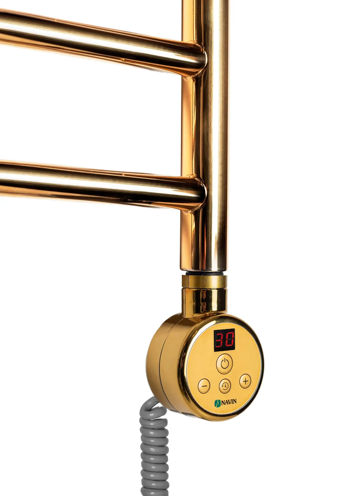 ТЕН NAVIN Digital 300W (покриття - під золото) можна встановити як на сушарку для рушників, під'єднану до системи гарячого водопостачання (опалення), так і на автономну сушку чи радіатор. Ця модель нагрівача має номінальну потужність 300 Вт і обладнана терморегулятором із вбудованою функцією таймера, тож ви можете додатково заощаджувати на енерговитратах.