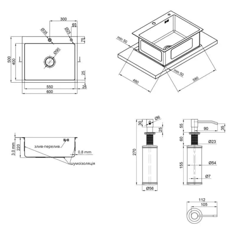 Набір 2 в 1 Lidz кухонна мийка H6050 Brush 3.0/1.0 мм + дозатор для миючого засобу LDH6050BRU35371 - комплексно вирішить проблему облаштування мийної зони. Набір включає стильну кухонну мийку, виготовлену з міцної нержавіючої сталі і дозатор для миючого засобу. Інтегрована мийка має три варіанти установки - урівень зі стільницею, над стільницею (аналогічно врізним мийкам) і під нею.