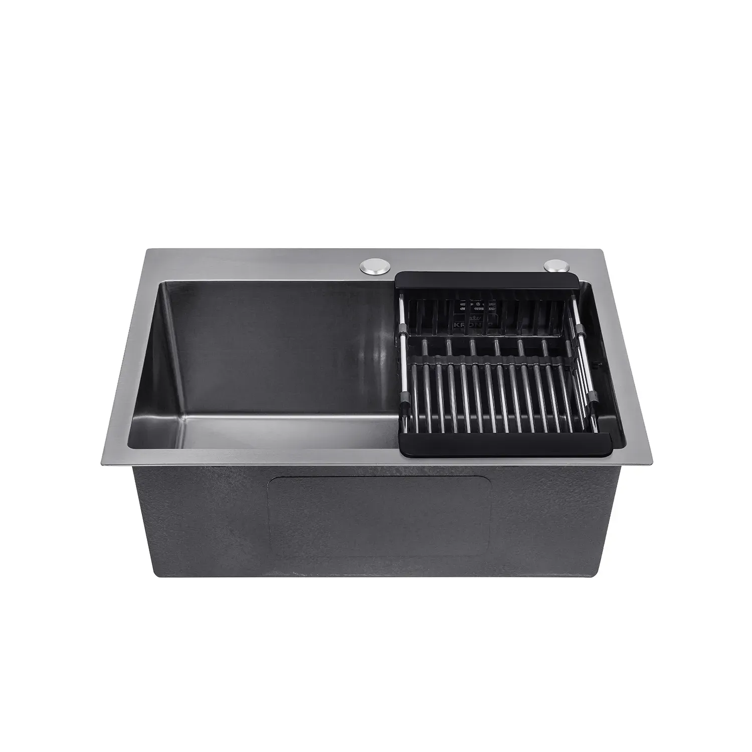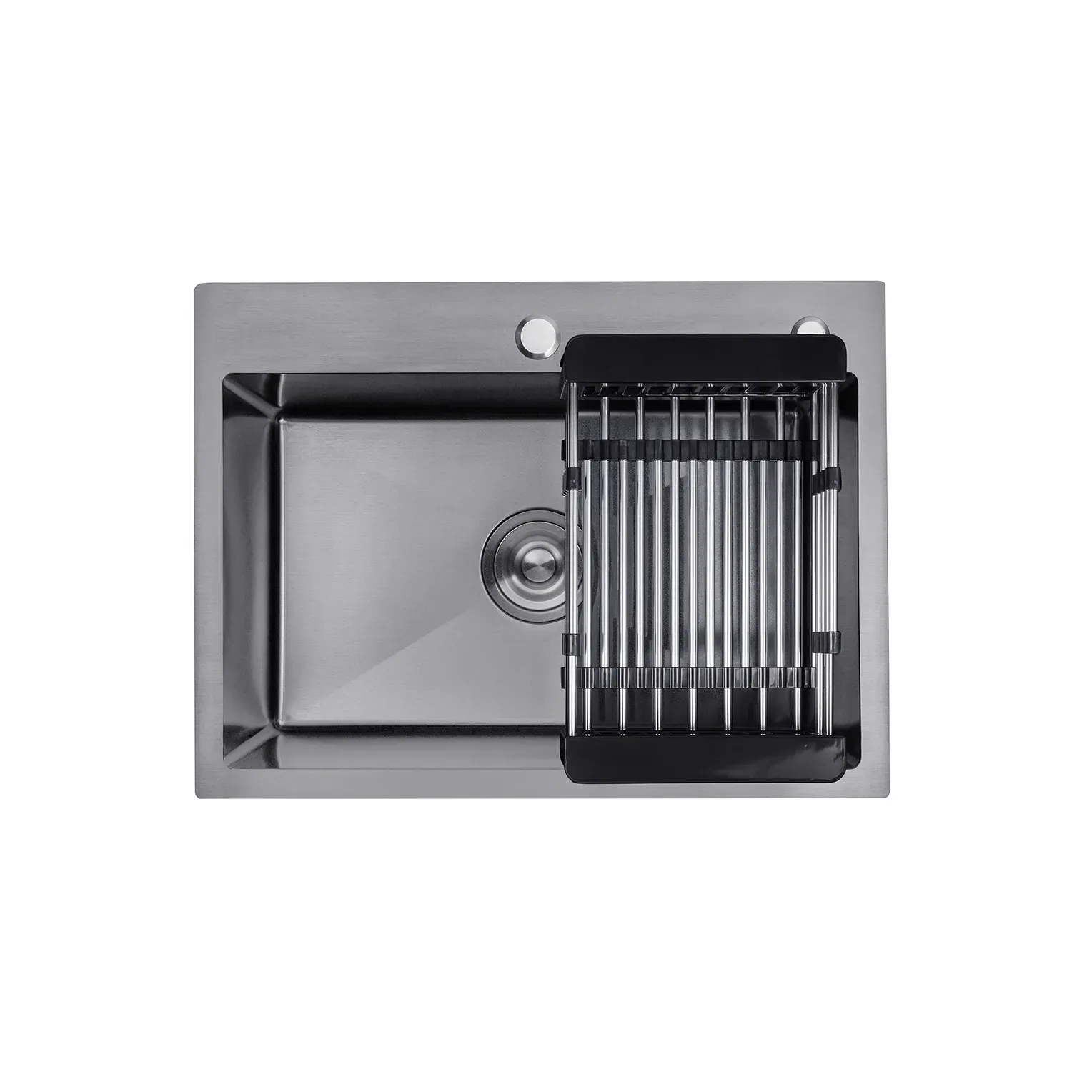 Кухонна мийка Kroner KRP Schwarze - 5843HM PVD (3.0/1.0 мм) - ідеальне рішення для сучасної кухні. Завдяки своїй прямокутній формі та стильному дизайну вона впишеться в будь-який інтер'єр. Інтегрований спосіб монтажу дозволяє безпроблемно встановити мийку. Виготовлена з високоякісної нержавіючої сталі. Практичне доповнення - вбудований отвір для дозатора миючого засобу. Функціональна, надійна та естетично приваблива - мийка від Kroner стане незамінним помічником у приготуваннях та прикрасою вашої кухні.