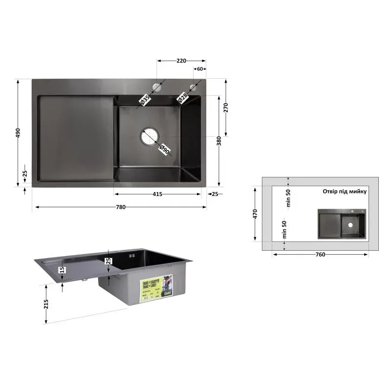 Мийка для кухні інтегрована Lidz Handmade H7849BL з крилом зліва у виконанні Brushed Black PVD (3,0/1,0 мм) – це функціональне та стильне рішення для вашої кухні. Чорне матове покриття захищає виріб від корозії та надає йому сучасного вигляду.