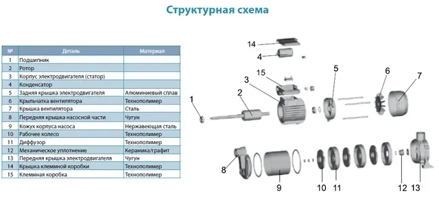 - Корпус: чавун з антикорозійною обробкою/нержавіюча сталь AISI 304;