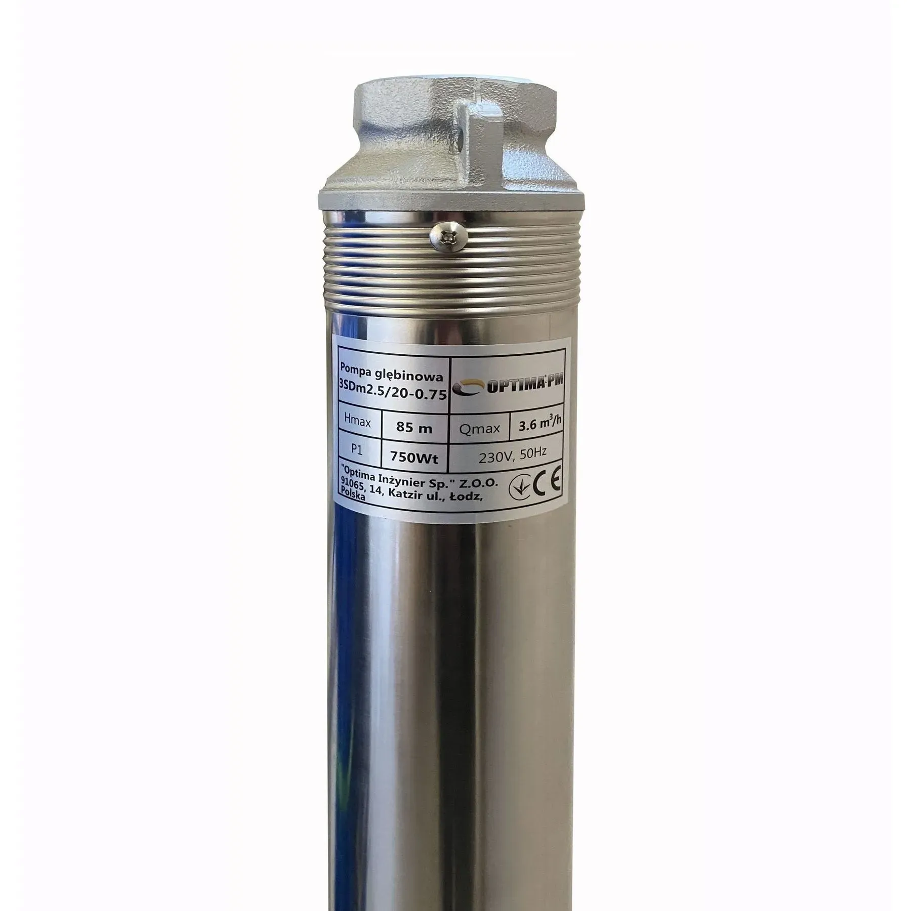 Насос OPTIMA PM 3SDm2.5 / 20 0.75 кВт 90м складається з двох частин: двигун в нижній частині і насос у верхній частині, жорстко з'єднані між собою зубчастої муфтою міжнародного стандарту Nema і має забір води в середній частині корпусу. Насос относятітся до насосів відцентрового типу і має багатоступеневу конструкцію і «плаваючі» робочі колеса, завдяки яким реалізується підвищена стійкість до піску (до 1000 г / м3).