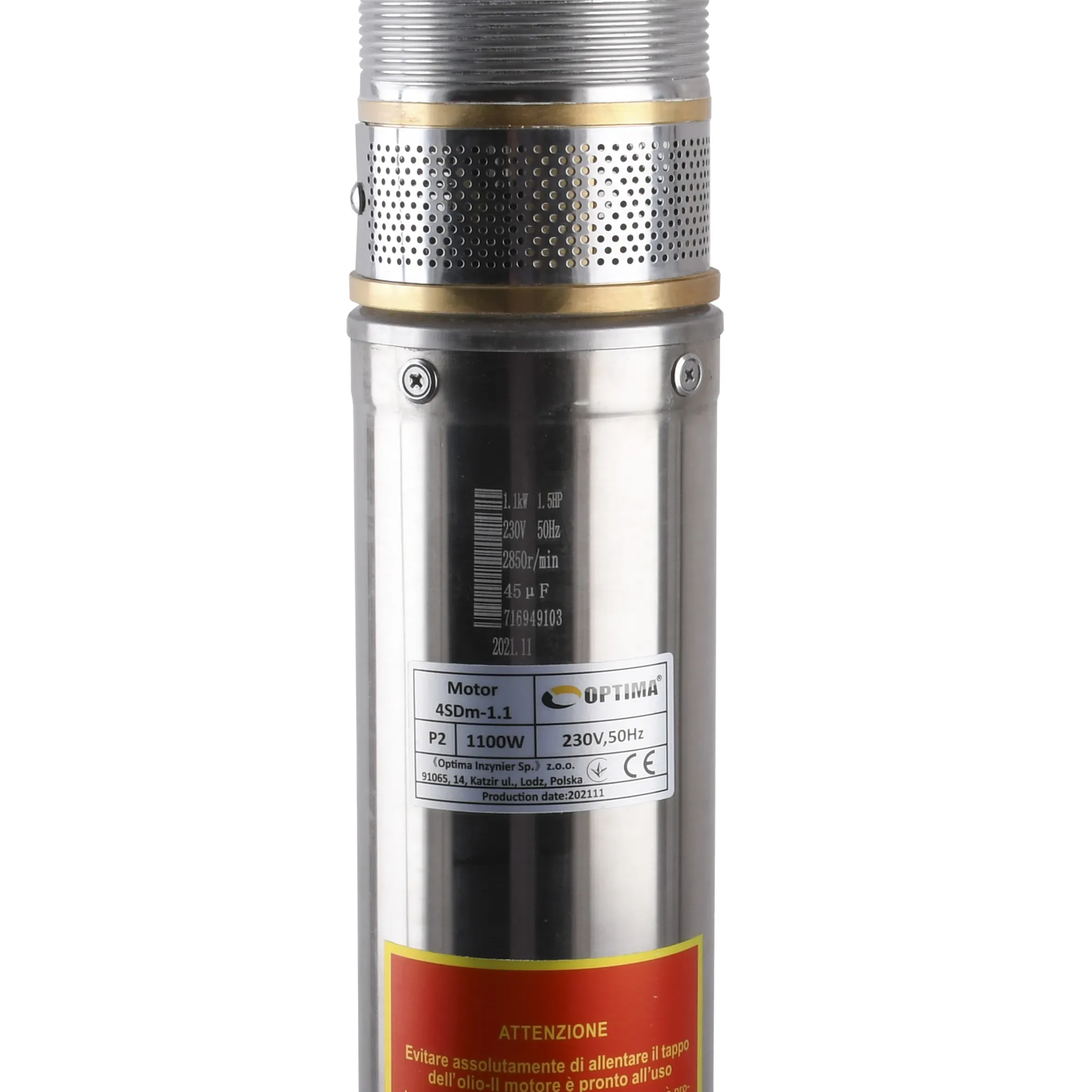 Насос OPTIMA 4SDm3 / 15 1.1 кВт 109м оснащений асинхронним однофазними двигуном з коротко замкнутим ротором і «плаваючим» робочим колесом, для реалізації підвищеної стійкості до піску. Насос комплектується вбудованим в пульт теплової захистом, а також конденсаторним блоком. Двигун заповнений спеціальним мінеральним маслом для ефективного охолодження (тепловіддачі в навколишнє середовище), а також для змащення й охолодження підшипників і механічного ущільнення.