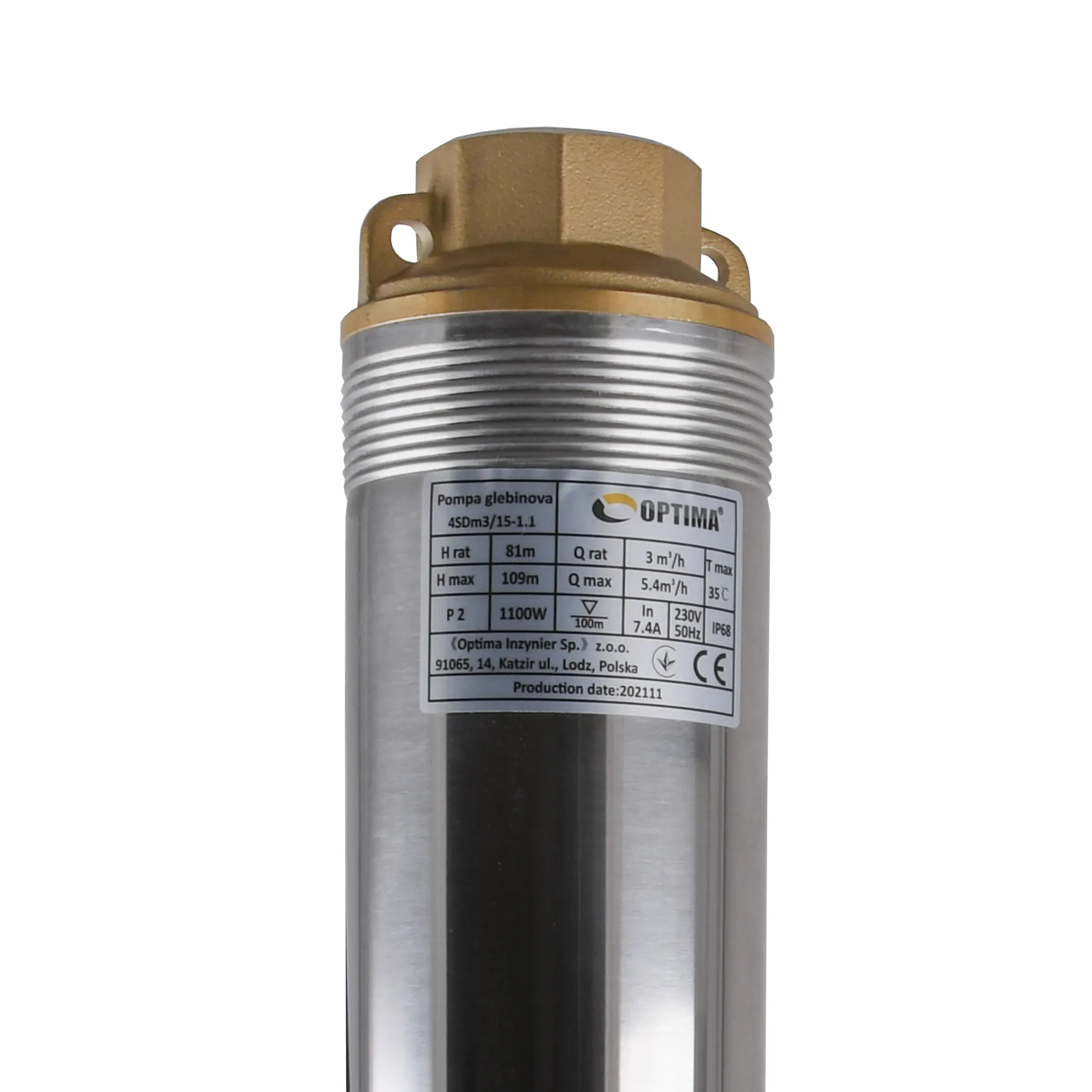Насос свердловинний з підвищеною стійкістю до піску OPTIMA 4SDm3 / 15 1.1 кВт 109м діаметром 4 ″призначений для подачі води з свердловин (діаметром від 4″ або 101 мм) і відкритих водойм з глибиною більше ніж 9 м, коли використання поверхневого насоса неможливо або недоцільно.