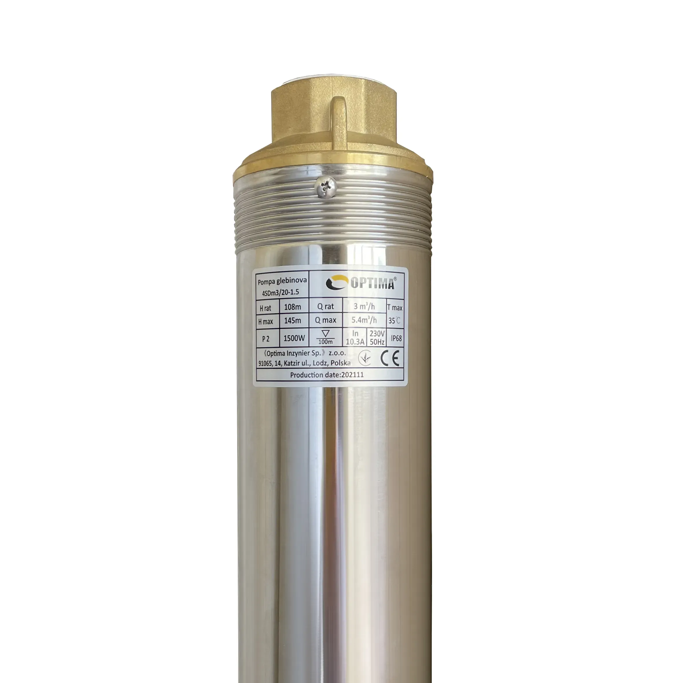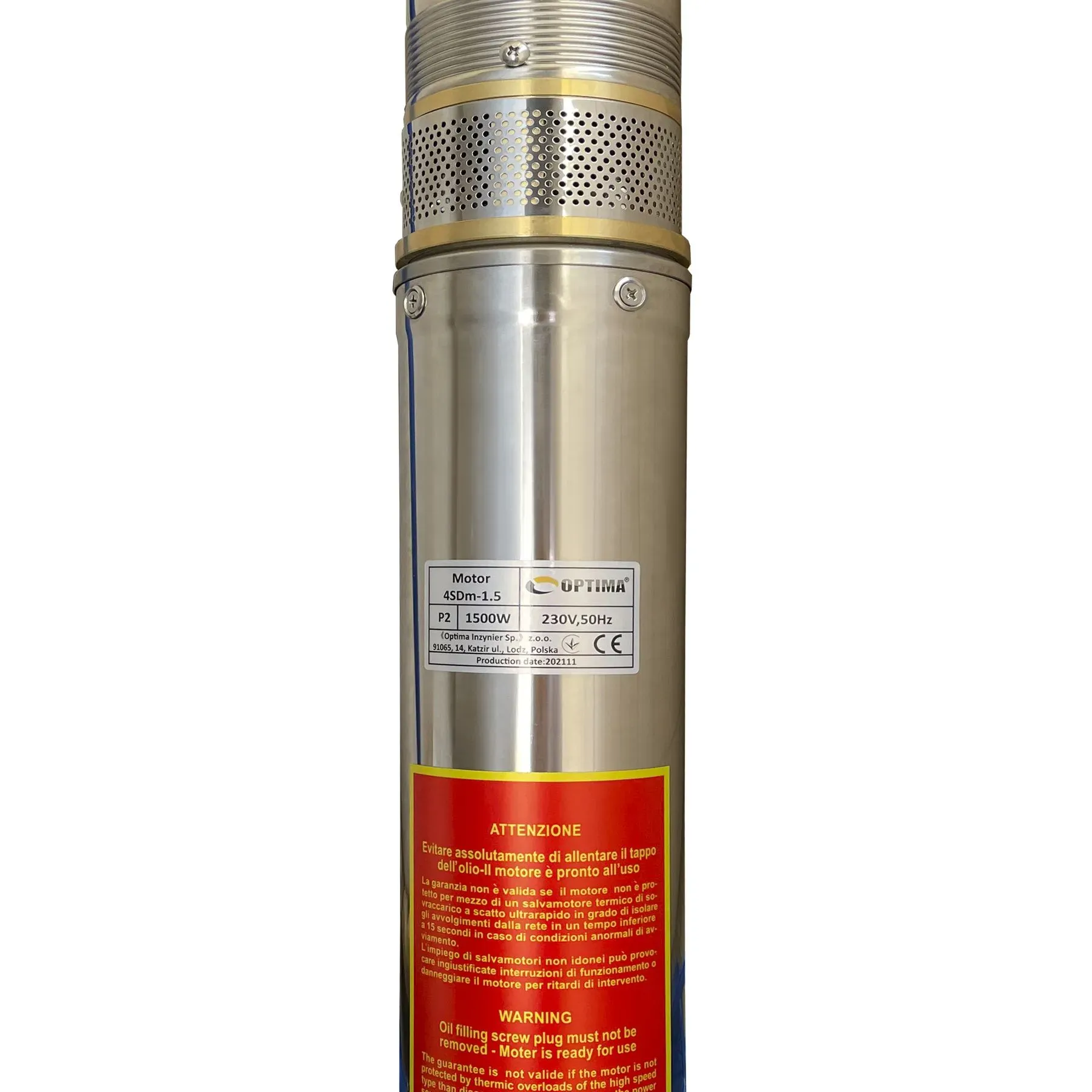 Насос OPTIMA 4SDm3 / 20 1.5 кВт 145м оснащений асинхронним однофазними двигуном з коротко замкнутим ротором і «плаваючим» робочим колесом, для реалізації підвищеної стійкості до піску. Насос комплектується вбудованим в пульт теплової захистом, а також конденсаторним блоком. Двигун заповнений спеціальним мінеральним маслом для ефективного охолодження (тепловіддачі в навколишнє середовище), а також для змащення й охолодження підшипників і механічного ущільнення.