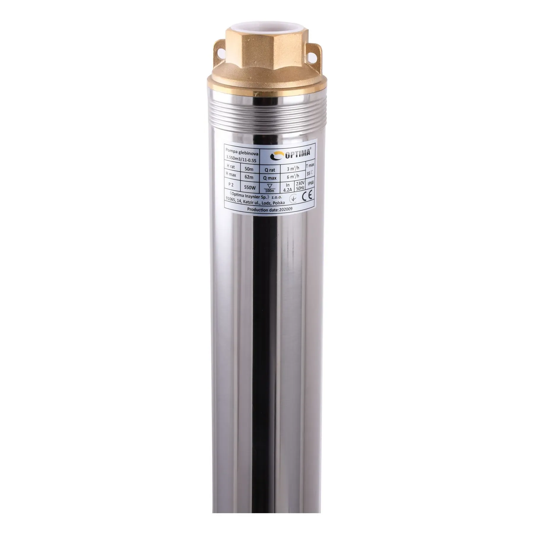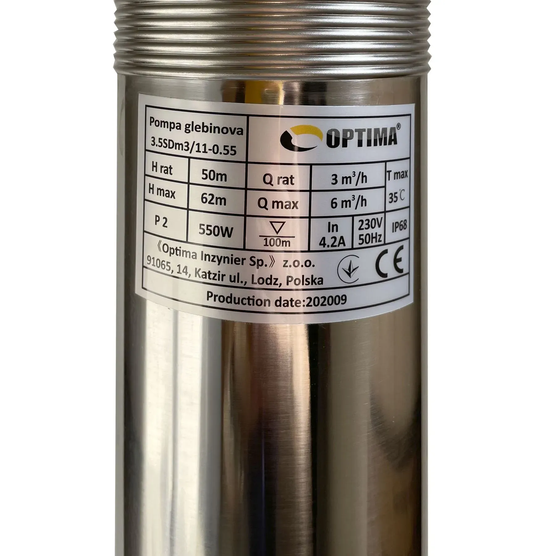 Насос OPTIMA 3.5SDm3 / 11 0.55 кВт 62м складається з двох частин: двигун в нижній частині і насос у верхній частині, жорстко з'єднані між собою зубчастої муфтою міжнародного стандарту Nema і має забір води в середній частині корпусу. Насос относятітся до насосів відцентрового типу і має багатоступеневу конструкцію і «плаваючі» робочі колеса, завдяки яким реалізується підвищена стійкість до піску (до 1500 г / м3).