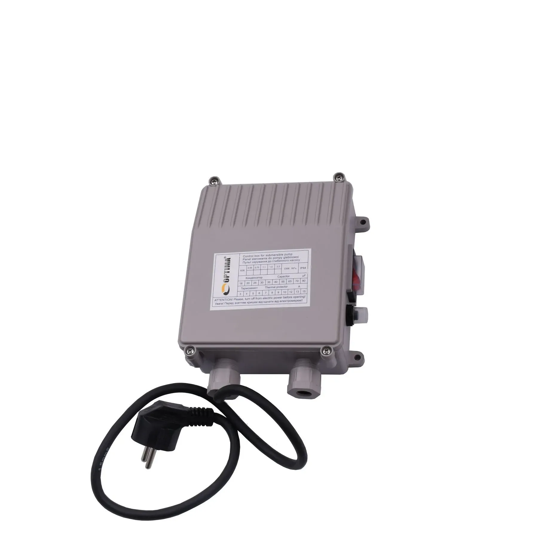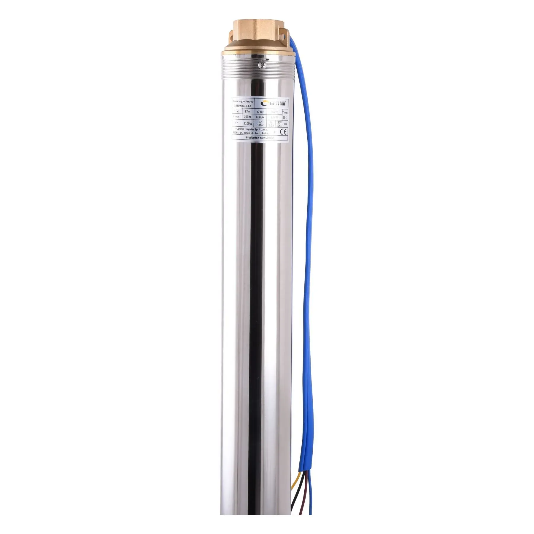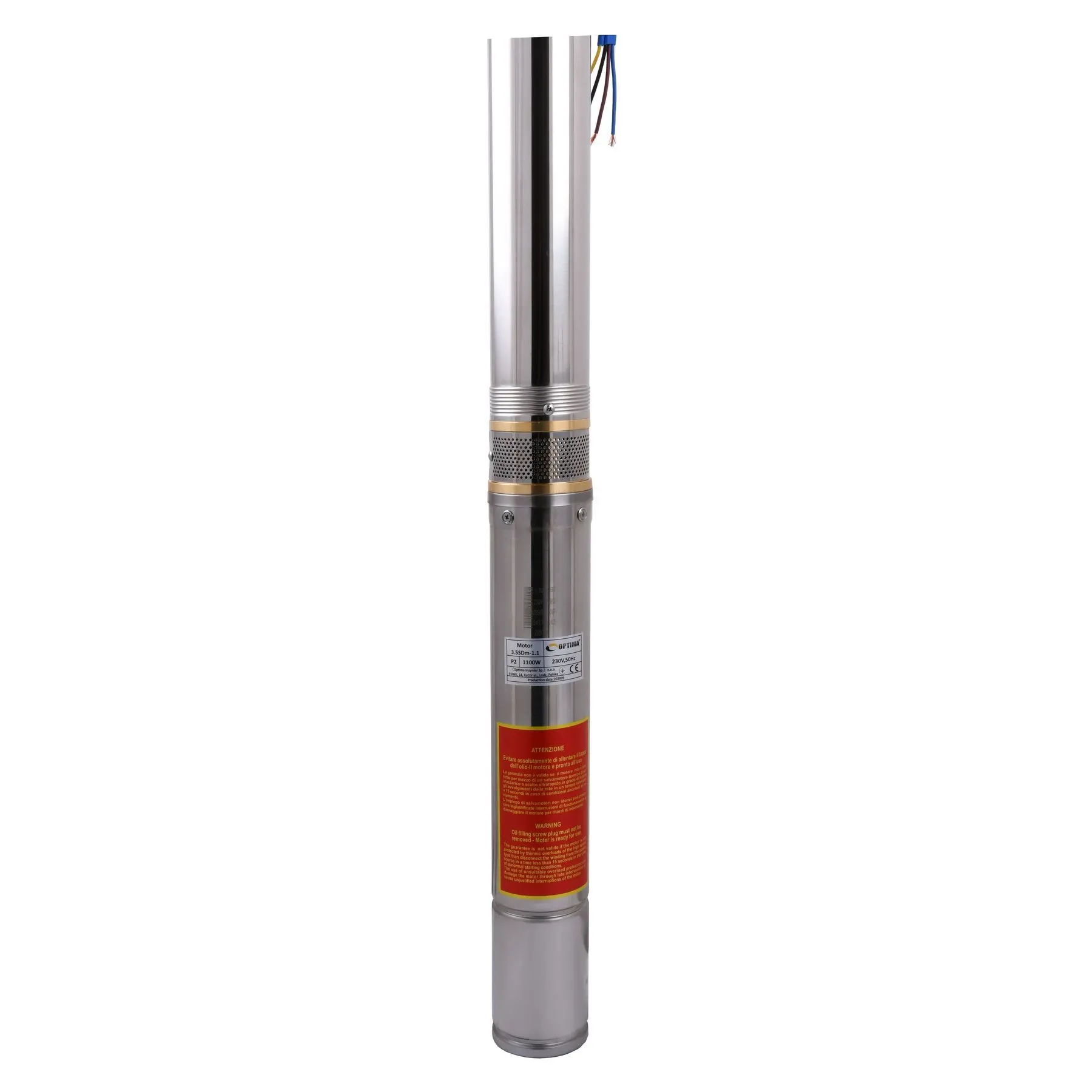 OPTIMA 3.5SDm3 / 19 1.1 кВт 103м оснащений асинхронним однофазними двигуном з коротко замкнутим ротором і «плаваючим» робочим колесом, для реалізації підвищеної стійкості до піску. Насос комплектується вбудованим в пульт теплової захистом, а також конденсаторним блоком. Двигун заповнений спеціальним мінеральним маслом для ефективного охолодження (тепловіддачі в навколишнє середовище), а також для змащення й охолодження підшипників і механічного ущільнення.
