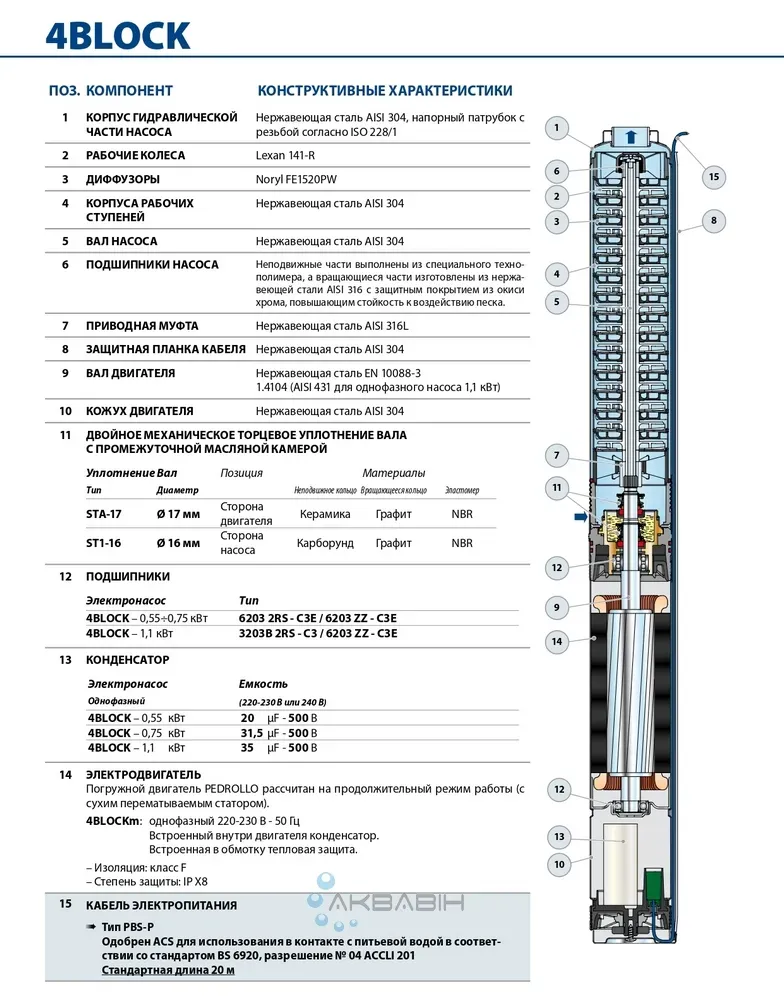 Насоси Pedrollo - це перевірена роками італійська надійність та довговічність, яка дуже добре себе зарекомендувала на українському ринку. Свердловинні моноблочні електронасоси з нержавіючої сталі 4BLOCK готові до установки. У комплекті: - конденсатор і тепловий захист вбудовані всередину двигуна - кабель електроживлення довжиною 20 метрів. Насоси даної серії рекомендуються для перекачування чистої води з колодязів (свердловин), що містить не більше 150 г/м³ піску. Завдяки високому ККД і їх надійності, ці насоси придатні для використання в побуті, для автоматичної подачі води спільно з автоматичними агрегатами підтримки тиску, для зрошення, т. д.