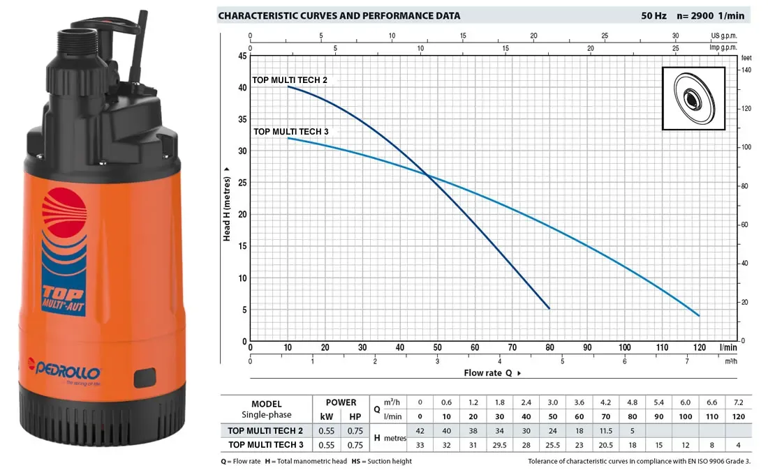 Усі основні деталі дренажного насосу PEDROLLO TOP MULTI 2 виготовлені з нержавіючої сталі або технополімеру. Оснащений поплавцевим вимикачем, який забезпечує безпечний режим роботи.