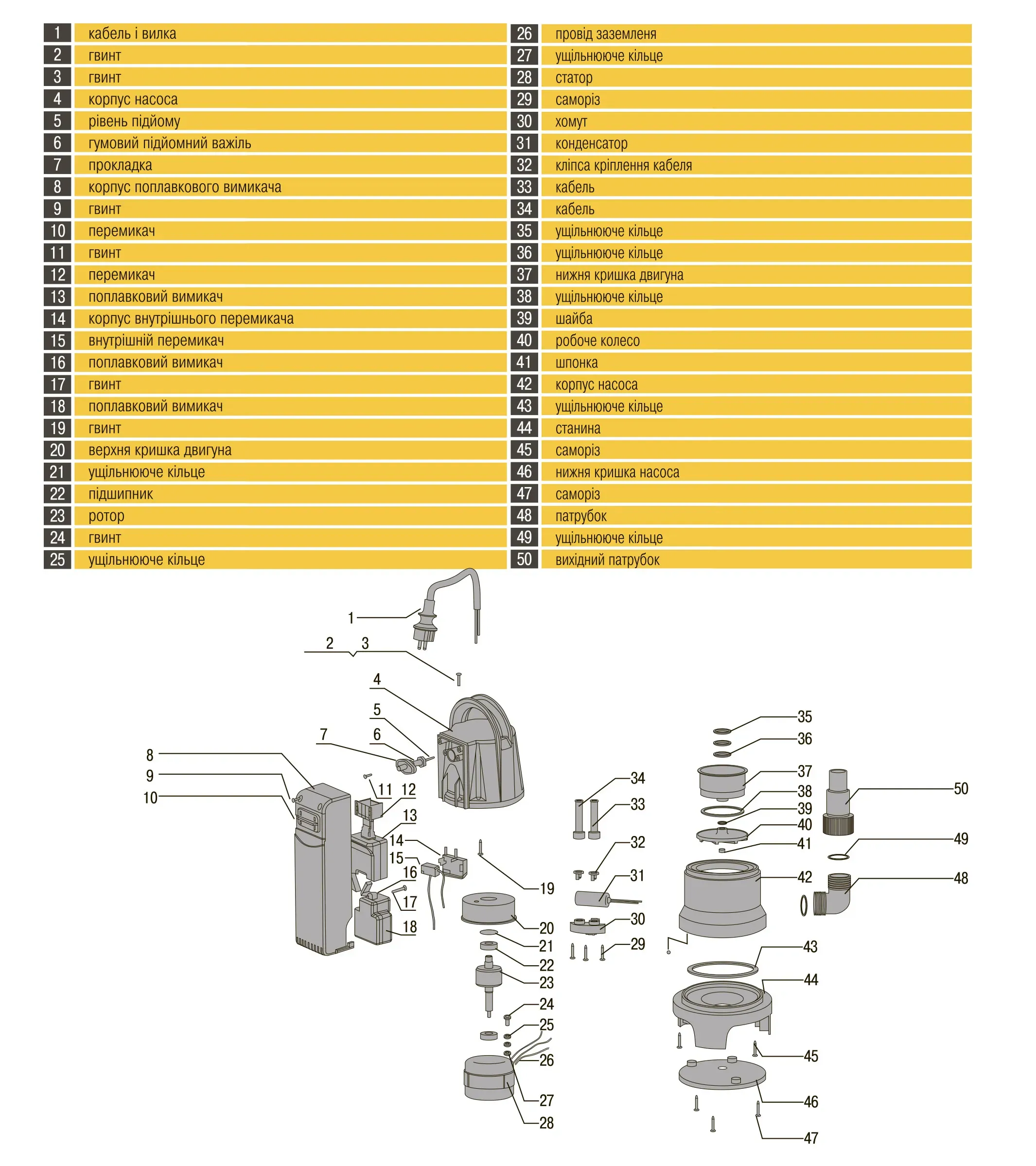 Насос складається з трьох основних вузлів - електродвигуна, відцентрового насоса і поплавкового вимикача. У нижній частині насоса розташовані усмоктувальні отвори. Корпус насоса і робоче колесо виконані з матеріалу, що має високі механічні властивості.