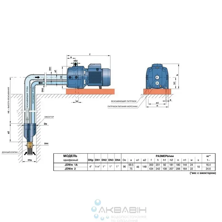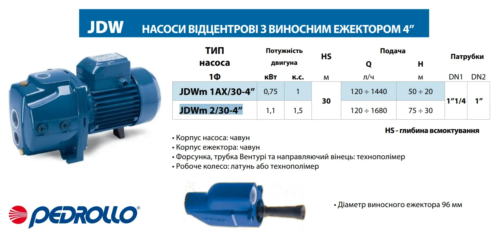 Насос відцентровий Pedrollo JDWm 2/30-4" з виносним ежектором 4" (96 мм)