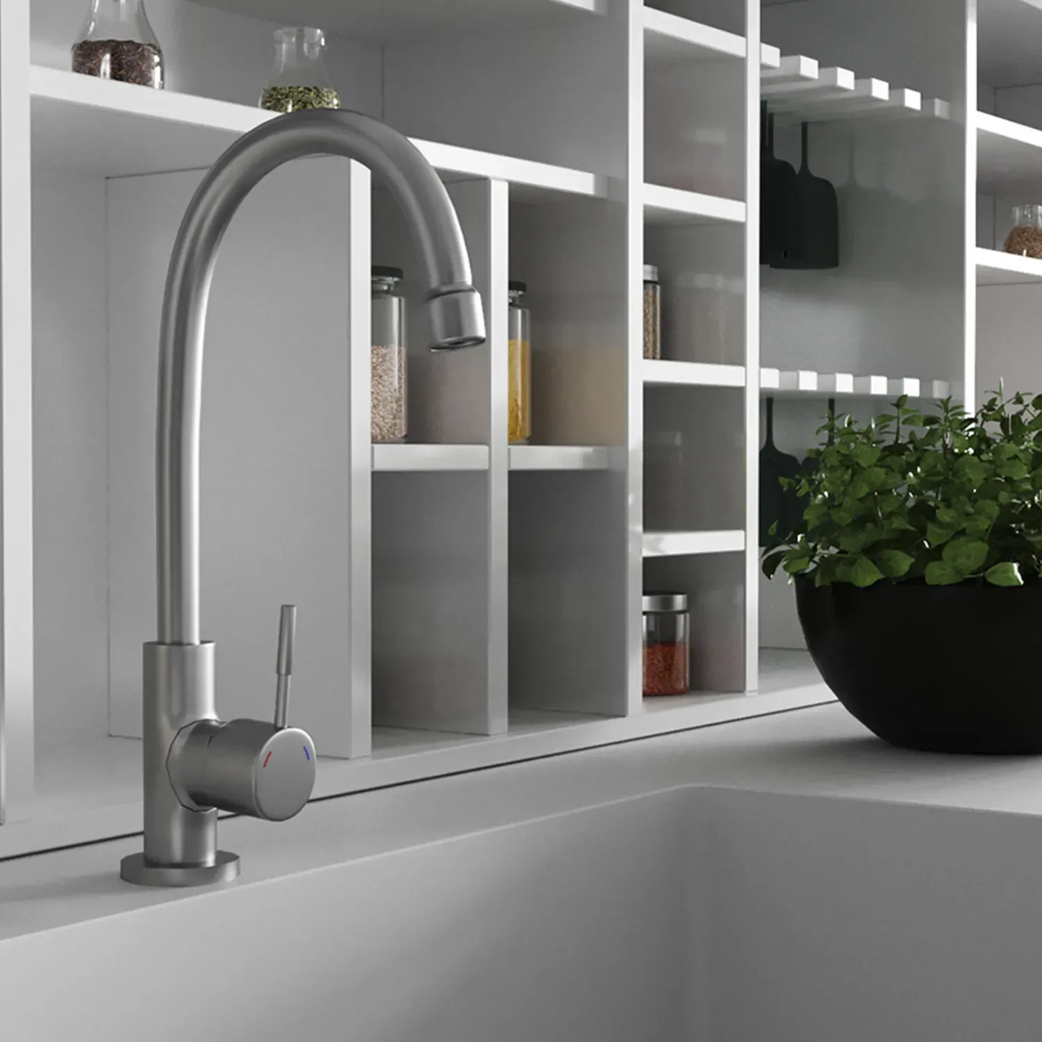 Цей кран від Kroner є практичним і естетично приємним вибором для вашої кухні, де функціональність і стиль поєднуються в ідеальному балансі.