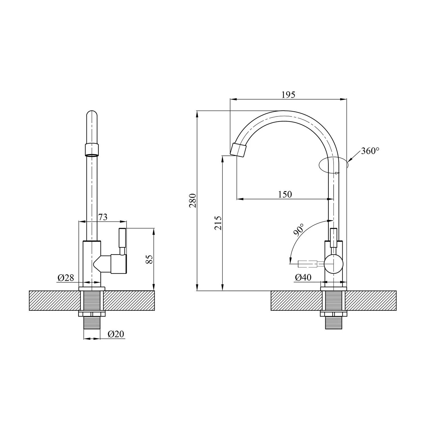 Кран призначений для врізного монтажу, що забезпечує зручне та міцне з'єднання з поверхнею. Тип виливу – поворотний, що збільшує функціональність крана.