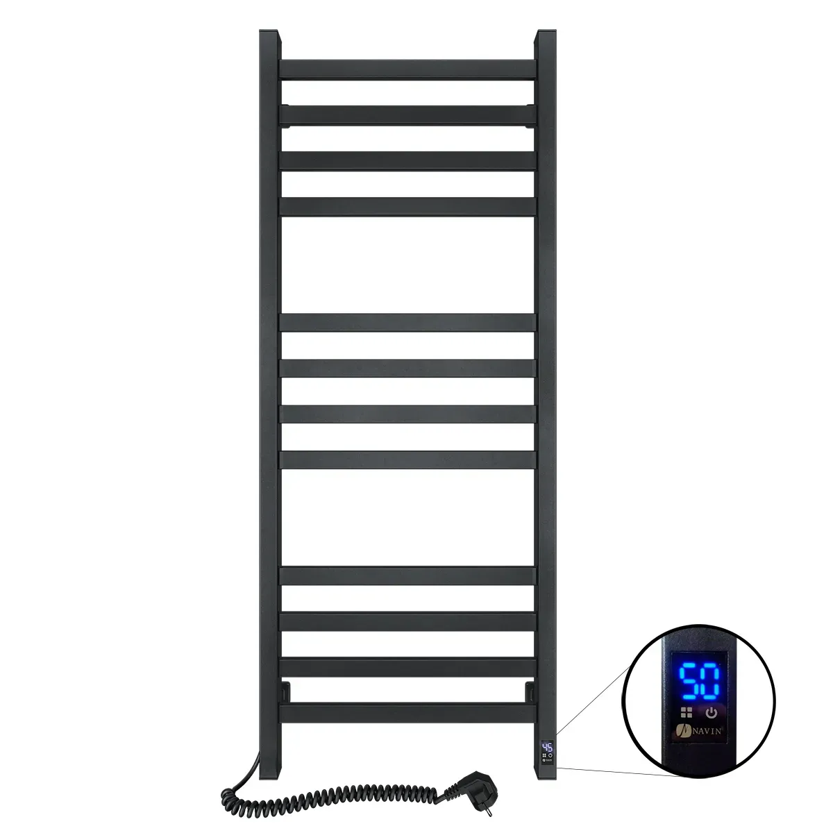 Рушникосушка Авангард 480х1200 Sensor (розташування шнура з вилкою — ліворуч; колір — чорний муар) від українського виробника NAVIN виготовлена з вуглецевої сталі, яка відрізняється високою якістю й міцністю. Модель має надійне порошкове покриття. Товщина стінки колекторів (стійок) і перемичок сушки для рушників дорівнює 1,5 мм.