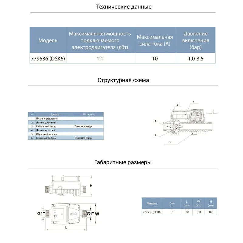 Контролер тиску DSK-6 призначений для автоматичного включення і виключення насосного обладнання. Він підтримує постійний тиск у водопроводі і захищає насос від сухого ходу: в тому випадку, коли тиск в системі падає нижче заданого мінімуму, відбувається відключення обладнання. Час спрацювання захисту становить 10 секунд. Конструкція доповнена зворотнім клапаном.