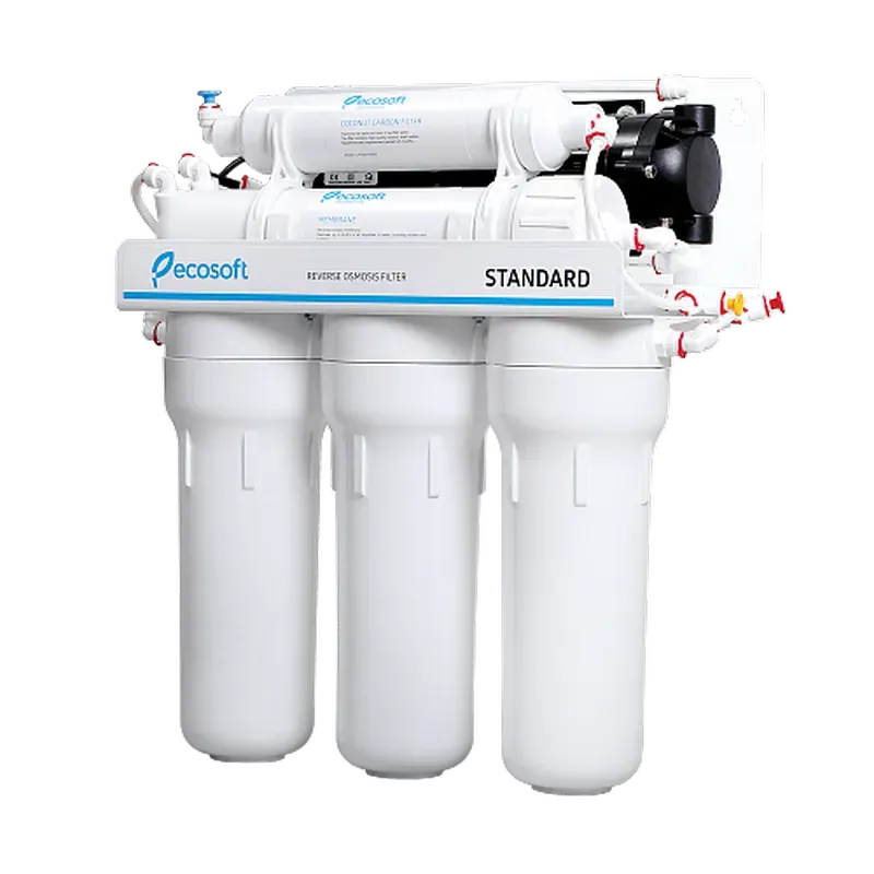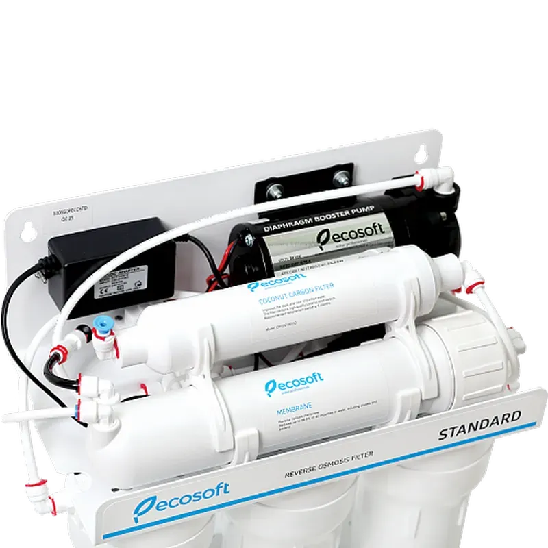 Зворотній осмос - найдосконаліша технологія очищення води, доступна для кожного. Фільтр зворотнього осмосу Ecosoft Standard призначений для очищення питної води в будинках і квартирах з низьким напором в трубопроводі холодної води. Фільтр видаляє 99,8% забруднень, в тому числі бактерії і віруси. Очищена вода повністю безпечна для організму людини. Вона ідеально підходить як для пиття, так і для приготування страв і напоїв. Основний елемент фільтра - мембрана зворотного осмосу продуктивністю 8 л/год.