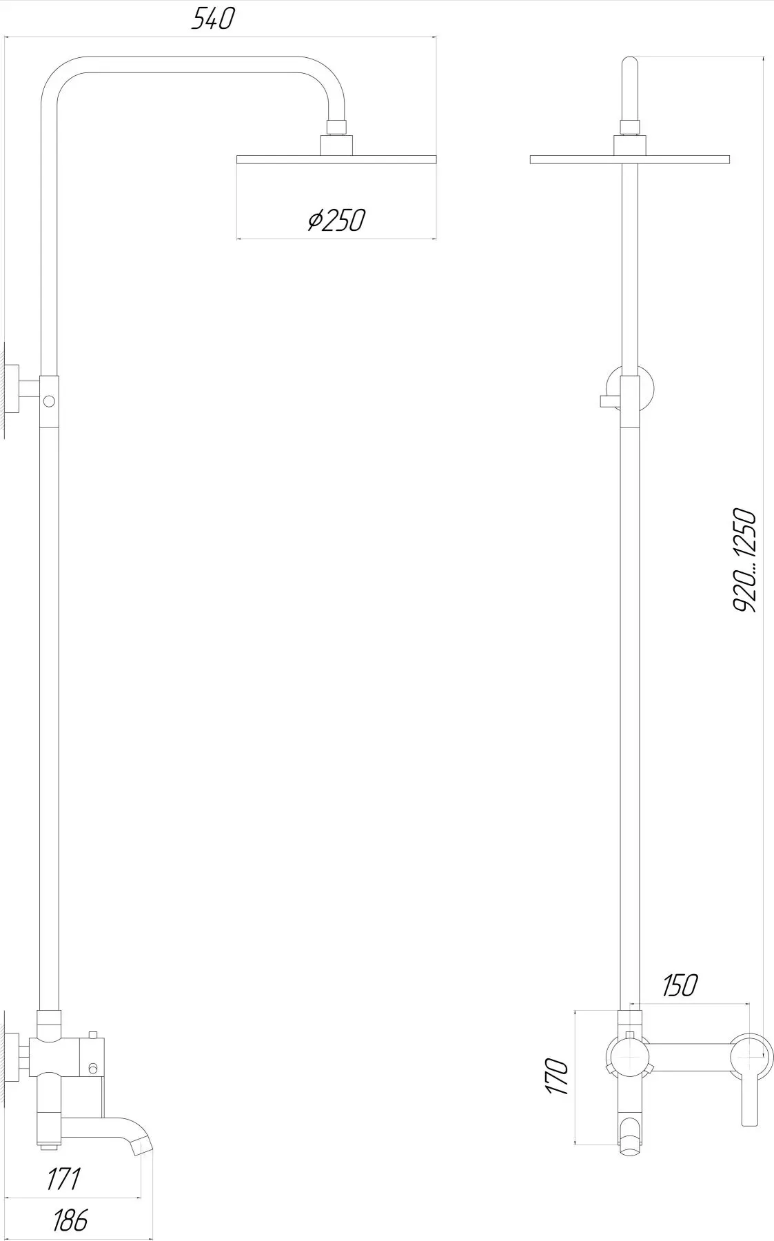 - верхній душ - кругла лійка 25 см, стійка