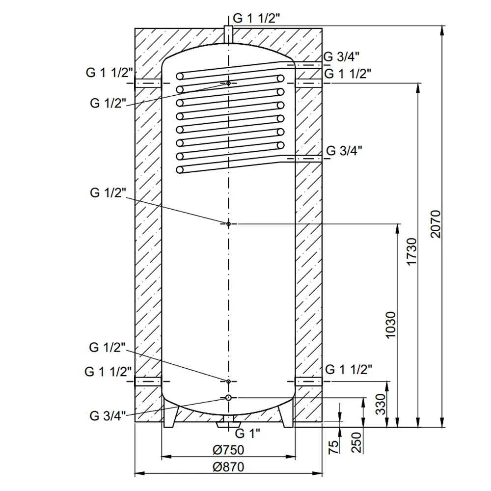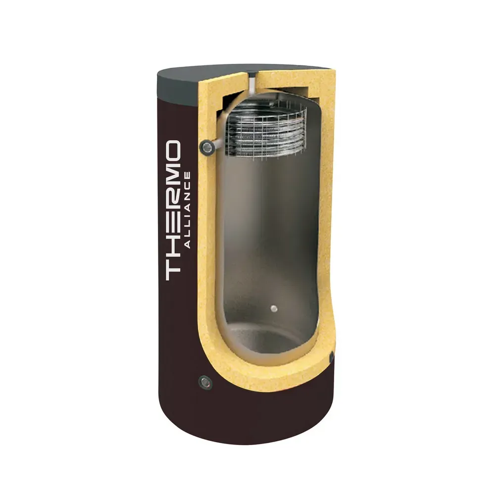 Теплоакумулятор Thermo Alliance TAI-10 750 виконує функцію накопичення, збереження, передачі теплоносія, отриманого від різних джерел, що працюють в одній системі. Наприклад, від твердопаливного котла та колектора сонячної енергії. Усередині буферного бака встановлений змійовик-теплообмінник, зроблений з нержавіючої сталі. Основне його завдання — забезпечення подачі гарячої води для господарських потреб. Гарантійний термін експлуатації виробу тривалий.
