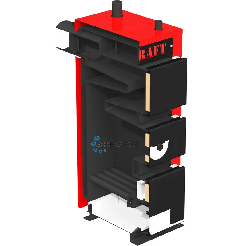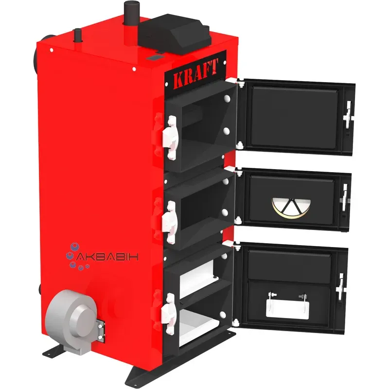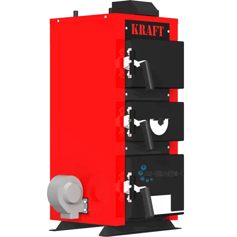 Твердопаливний котел KRAFT серії E NEW - це бюджетний котел, вироблений з високоякісної (котельної) сталі, що працює на будь-якому твердому паливі. Котел має ефективність на рівні 85% завдяки великому теплообміннику, який знаходиться у верхній його частині. Час роботи на одному завантаженні дров близько 5-6 годин. На вугіллі ж цей показник сягатиме 10-12 годин.