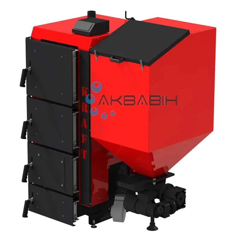 Пелетний котел KRAFT серії R - це котел з автоматичною подачею палива, обладнаний польським пальником ретортного типу Pancer Pol. Перевага такого пальника в його простоті, а головне - він працює як на пеллетах, так і на вугіллі. При конструюванні цього типу котлів за основу були взяті котли серії L. Тобто пелетний котел має збільшений теплообмінник, який гарантує заявлену потужність. Принцип роботи агрегату полягає в тому, що пальник входить в котел збоку. Там же встановлюється і бункер для палива. За бажанням замовника пальник може бути прикручена як з лівого боку котла, так і з правого.