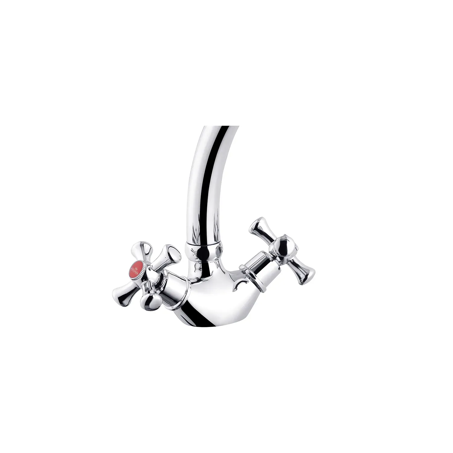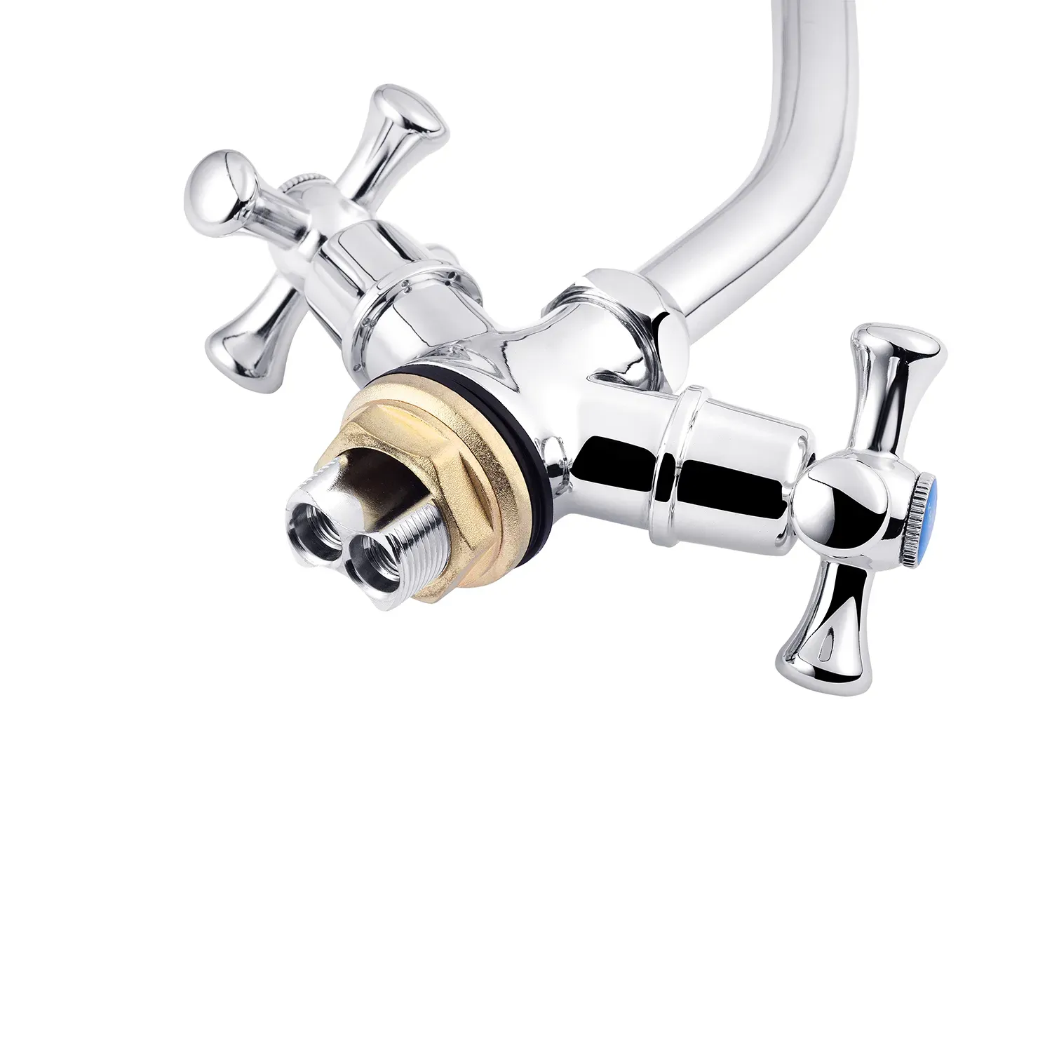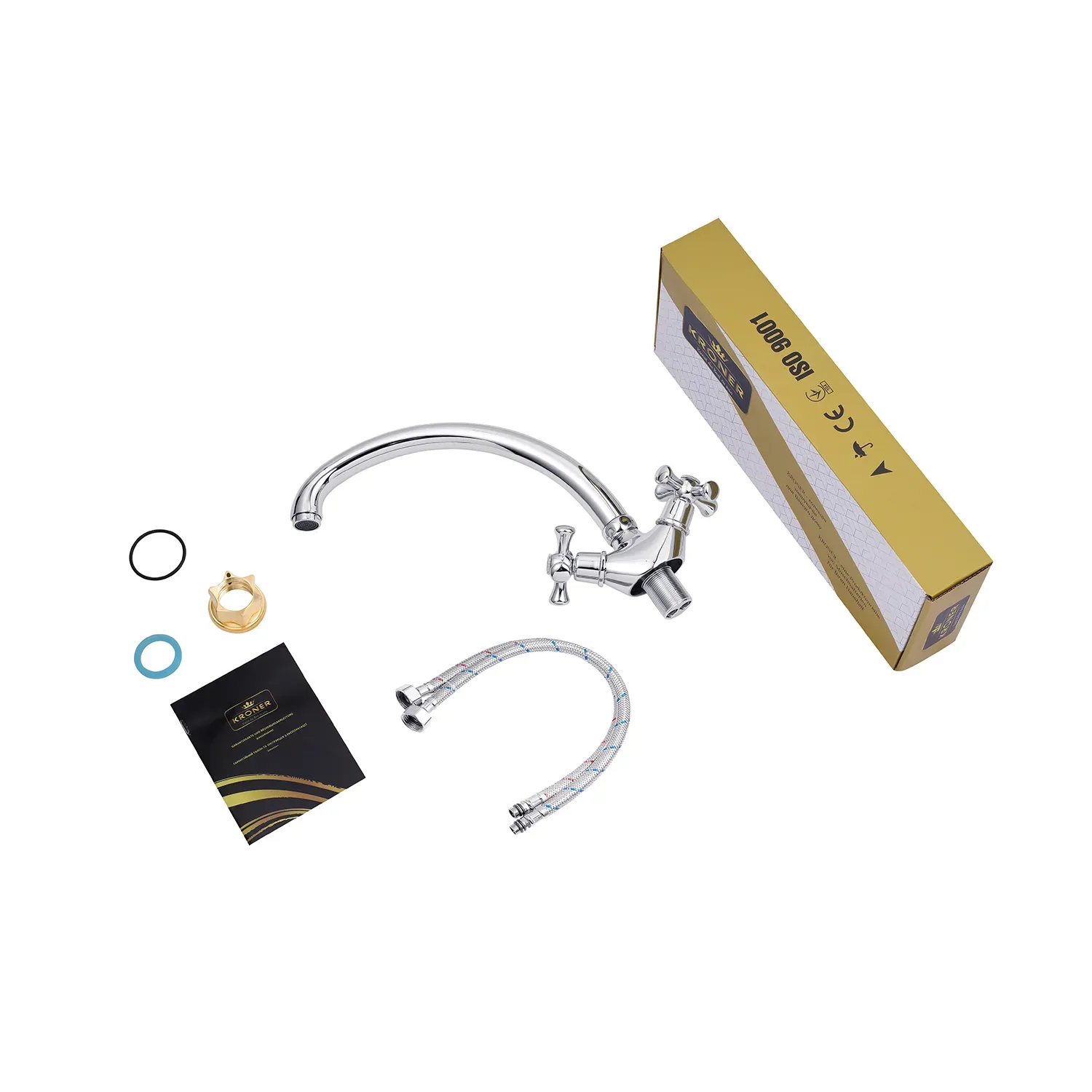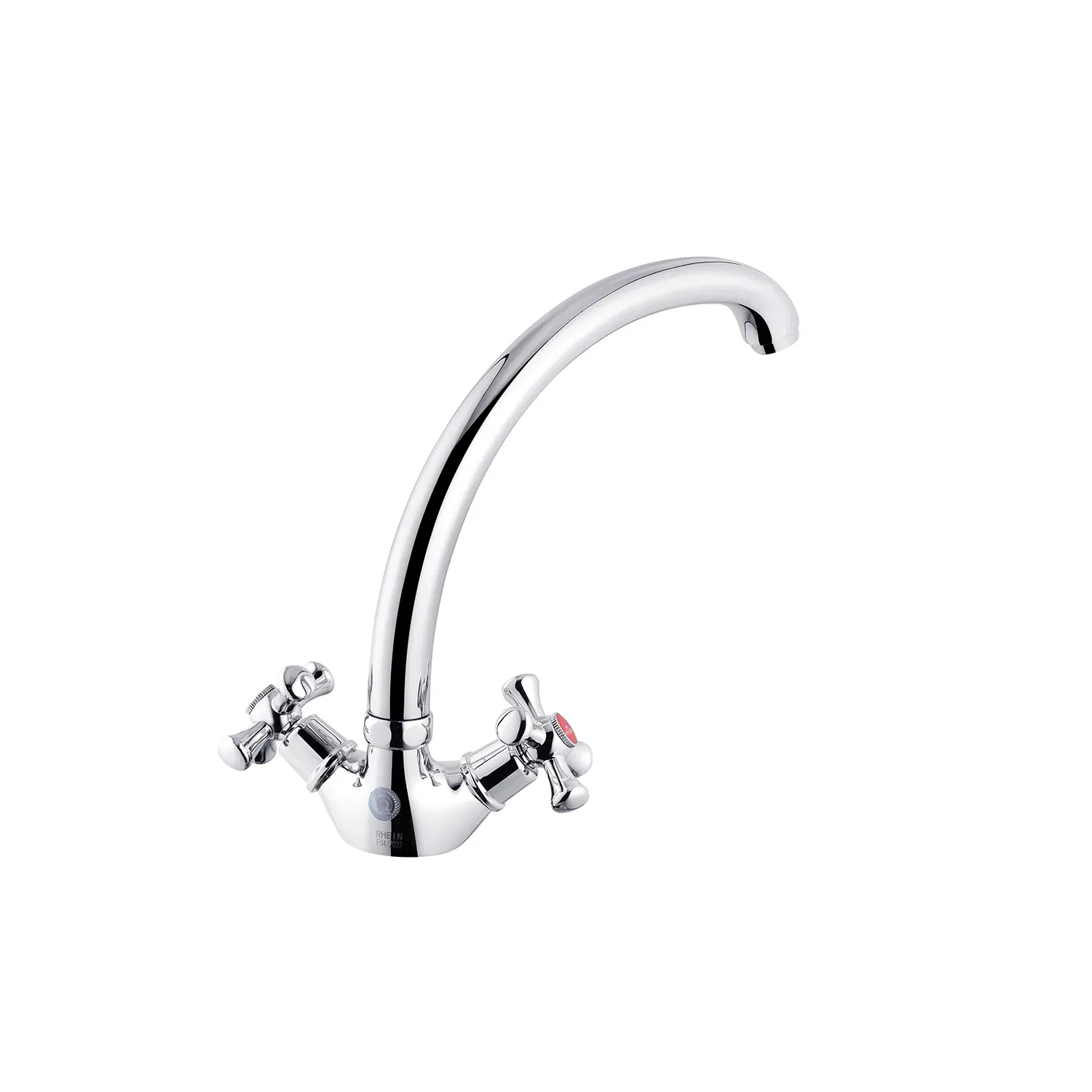 Змішувач для кухні Kroner KRM Rhein - C032 - ідеальний вибір для вашої кухні. Виготовлений з високоякісного силуміну, він забезпечує надійність та довговічність використання. Хромований колір і глянцева поверхня надають йому стильний вигляд, вписуючись в будь-який дизайн кухні. Форма С-подібного виливу дозволяє легко наповнювати великі каструлі і зручно мити посуд. Механізм змішування на основі кран-букси сприяє точному регулюванню температури води. Насолоджуйтесь функціональністю і стилем змішувача Kroner.