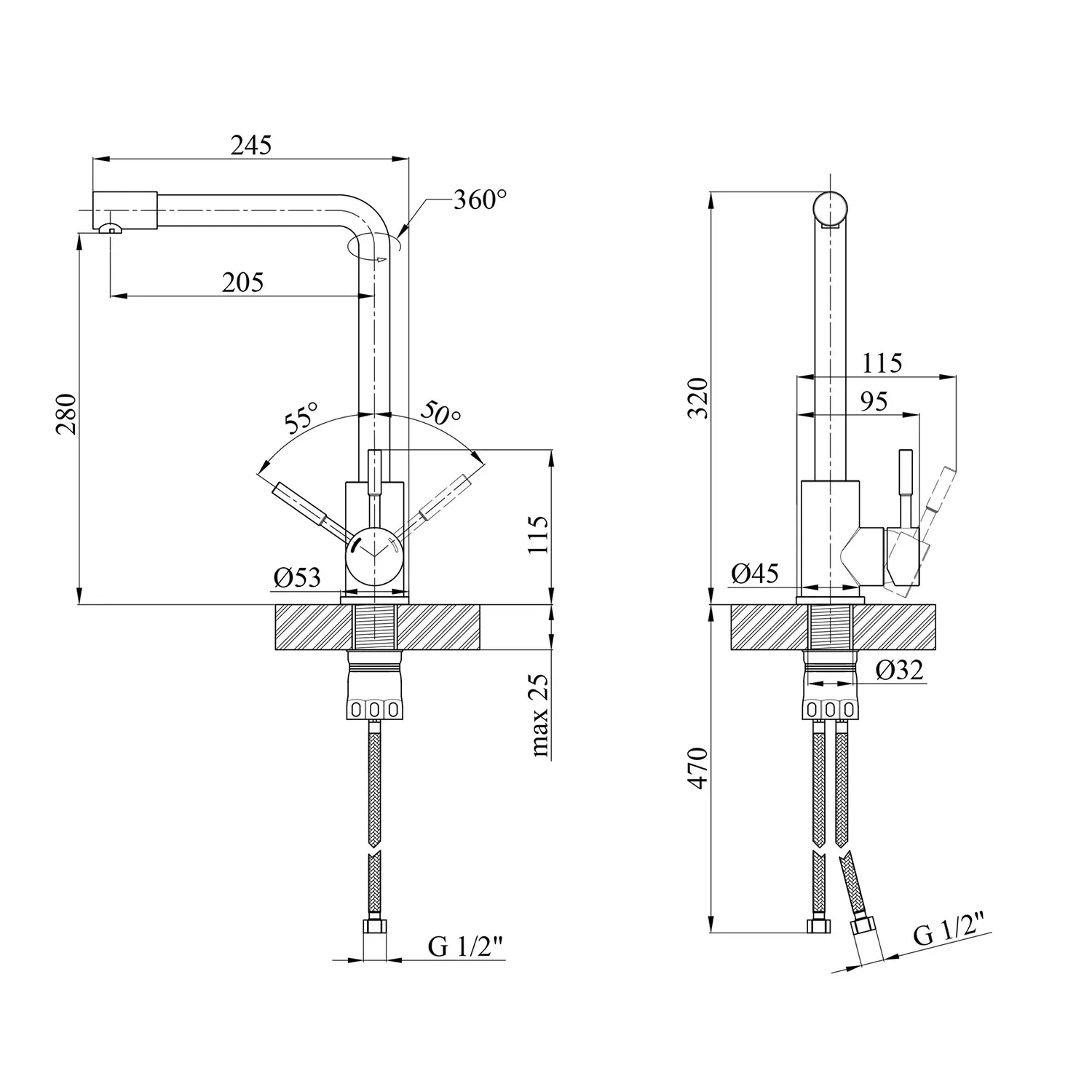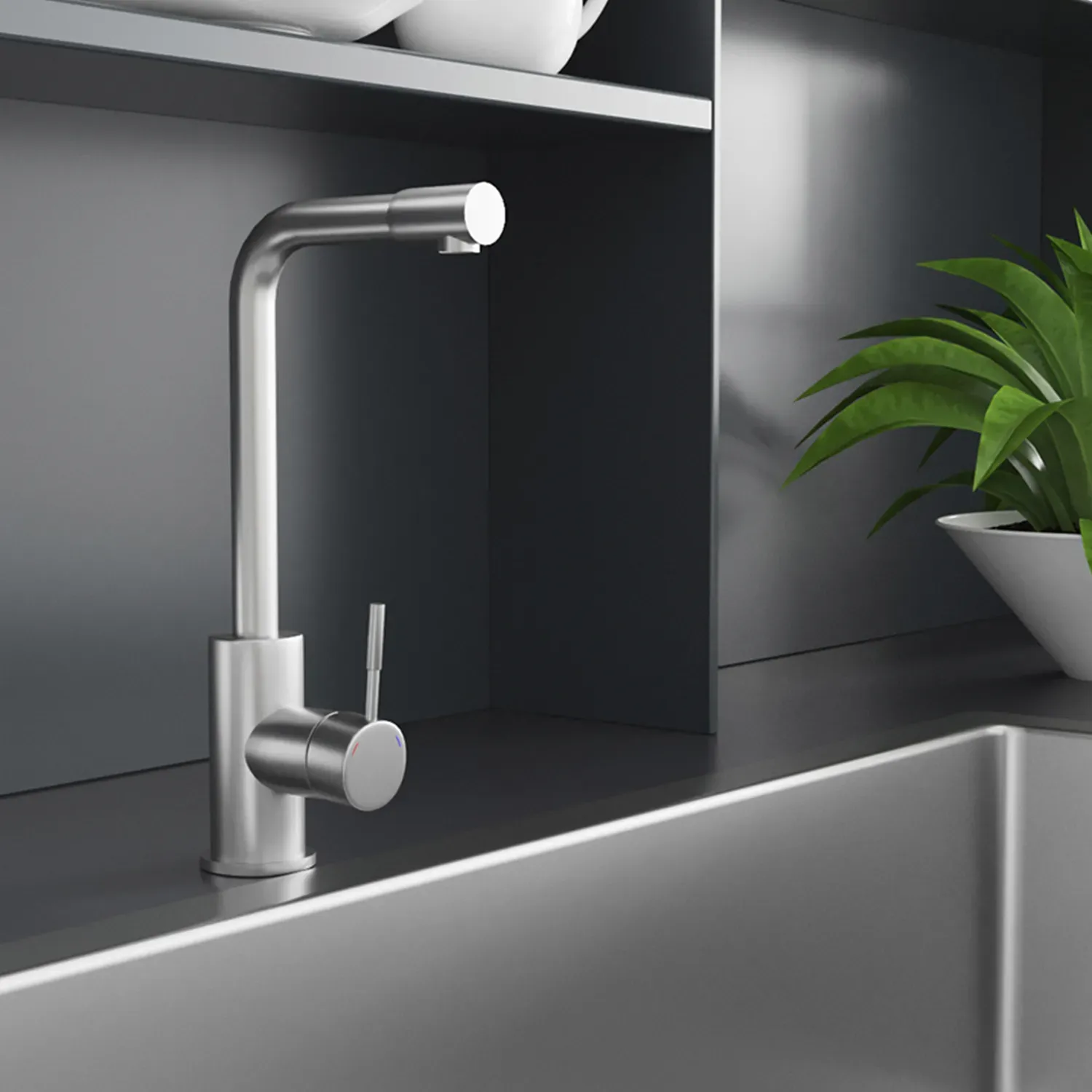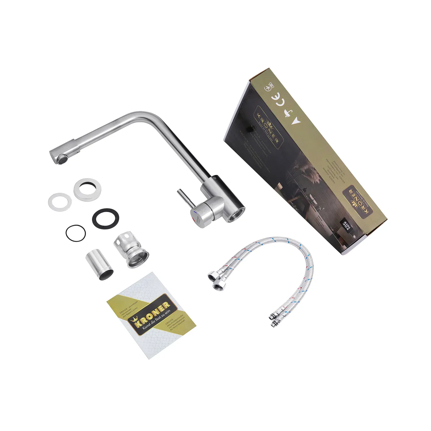 Змішувач для кухні Kroner KRP Edelstahl Klassisch - ESG034 - ідеальний вибір для вашої кухні. Виготовлений з нержавіючої сталі, він гарантує міцність та довговічність. Має привабливий брашований нікелевий колір, що додає йому елегантності. Змішувач оснащений картриджним механізмом змішування, що дозволяє зручно регулювати температуру води. Його унікальна Г-подібна форма виливу забезпечує зручність під час наповнення посуду або миття продуктів. Насолоджуйтесь функціональністю і стилем змішувача Kroner.