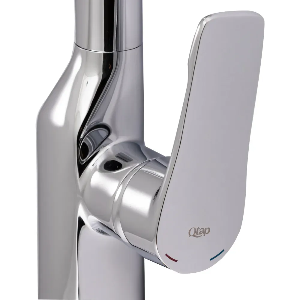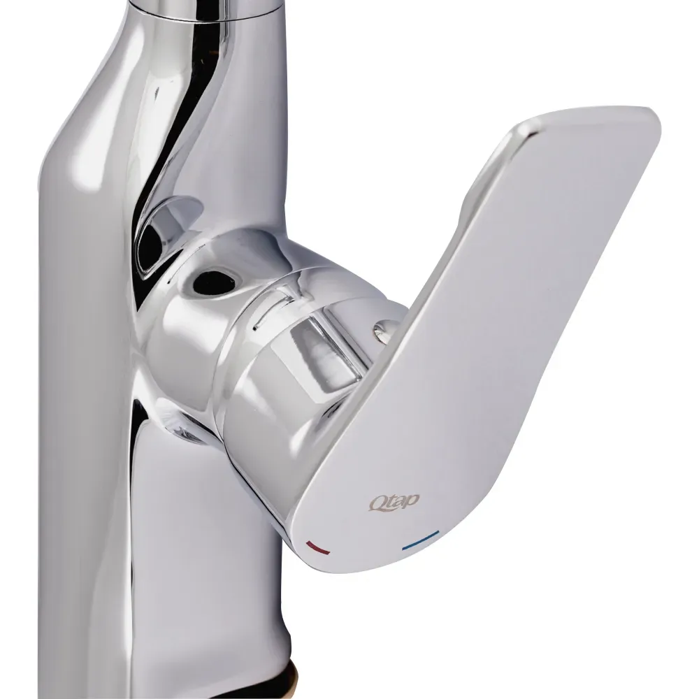 Змішувач для кухні Qtap Vitkov 9019104FC виготовлено з високоякісної харчової латуні, що не схильна до корозії, стійка до ударів і появи тріщин. Глянцеве хромоване покриття не тільки збільшує довговічність змішувача, а й надає йому привабливості. Змішувач має одноважільне управління, за допомогою якого можна відрегулювати температуру і натиск води. Виріб виконано в сучасному стилі і ідеально підійде до будь-якого інтер‘єру кухні.
