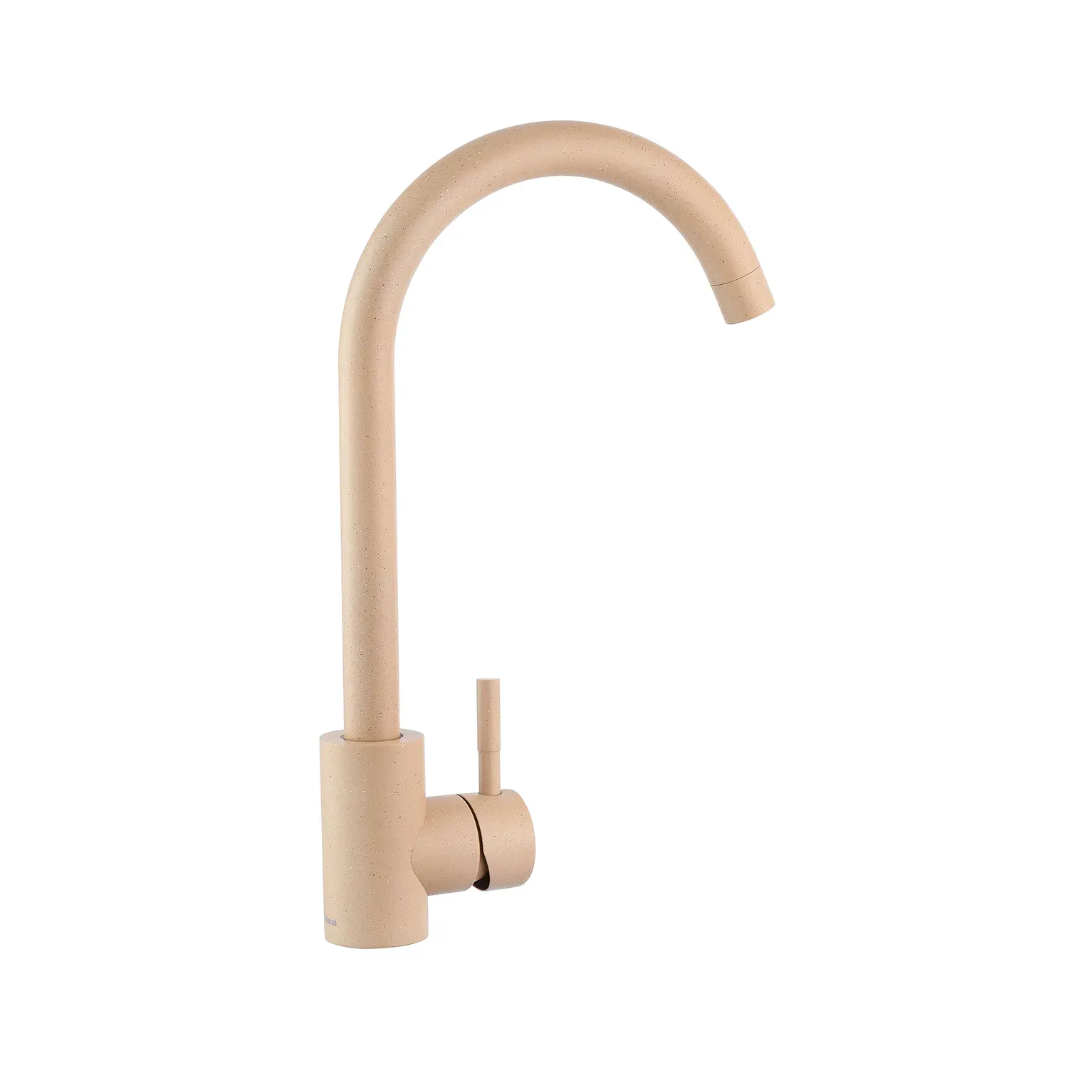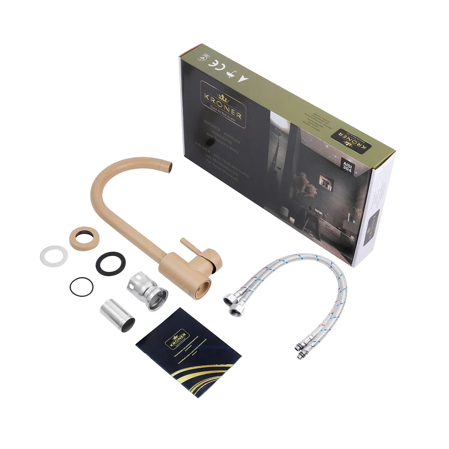 Змішувач для кухні Kroner KRP Edelstahl Klassisch - COL035 - ідеальний вибір для вашої кухні. Виготовлений з нержавіючої сталі, він гарантує міцність та довговічність. Має привабливий матовий бежевий колір, що додає йому елегантності. Змішувач оснащений картриджним механізмом змішування, що дозволяє зручно регулювати температуру води. Його унікальна U-подібна форма виливу забезпечує зручність під час наповнення посуду або миття продуктів. Насолоджуйтесь функціональністю і стилем змішувача Kroner.