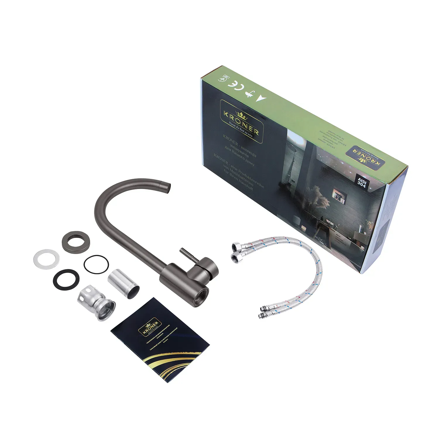 Кухонні змішувачі від Kroner – це німецька якість, технологія та надійність. Сучасний дизайн стане вдалим доповненням інтер’єру кухні. Виготовленні з якісних матеріалів, що не піддаються корозії, легкість у збірці не завдасть клопоту при монтажу та використанні. Мають поворотний вилив і встановлюється на один отвір із підведенням води за допомогою гнучких шлангів М10х1/2". Шланги для підключення входять у комплект. Данна модель виготовлена з нержавіючої сталі AISI 304.