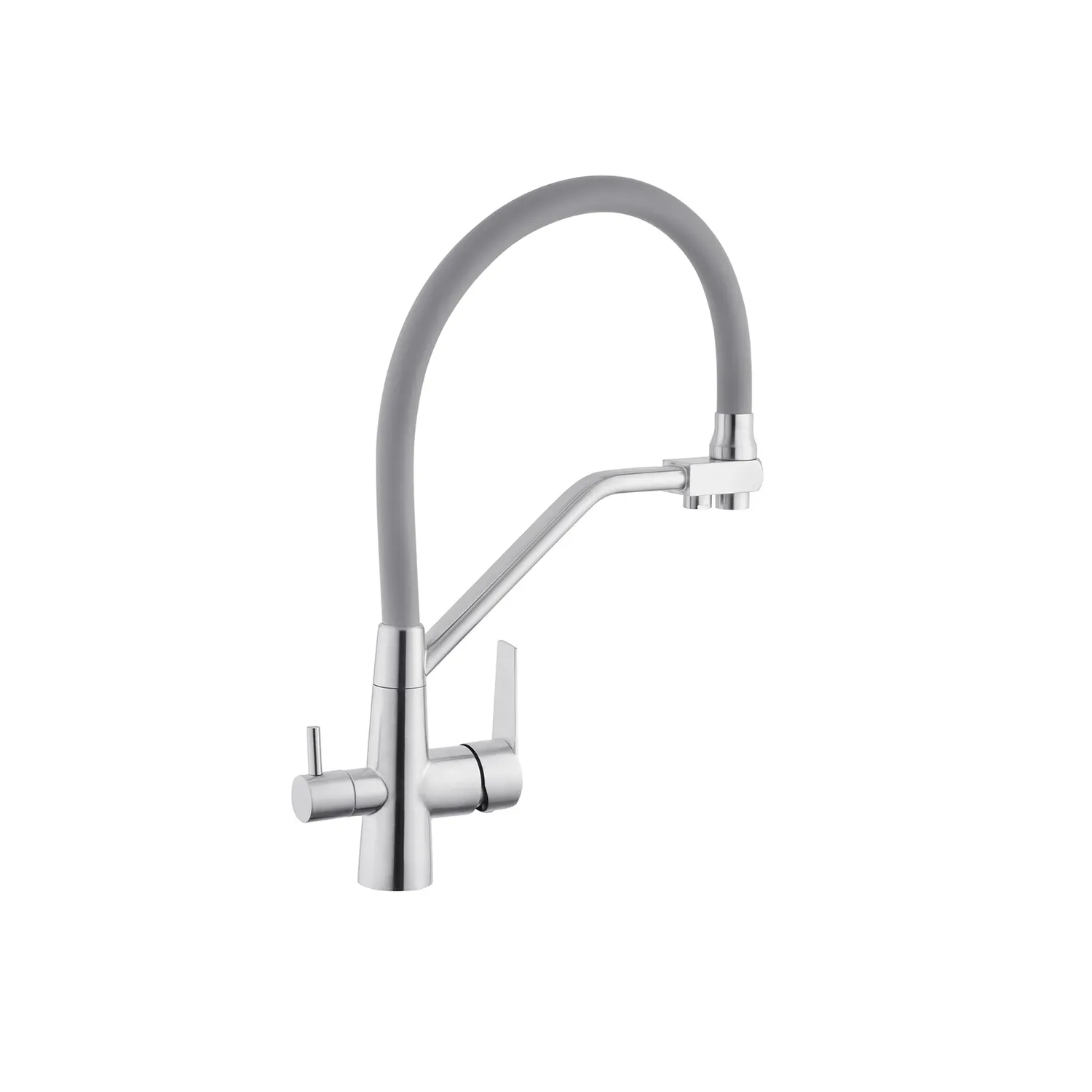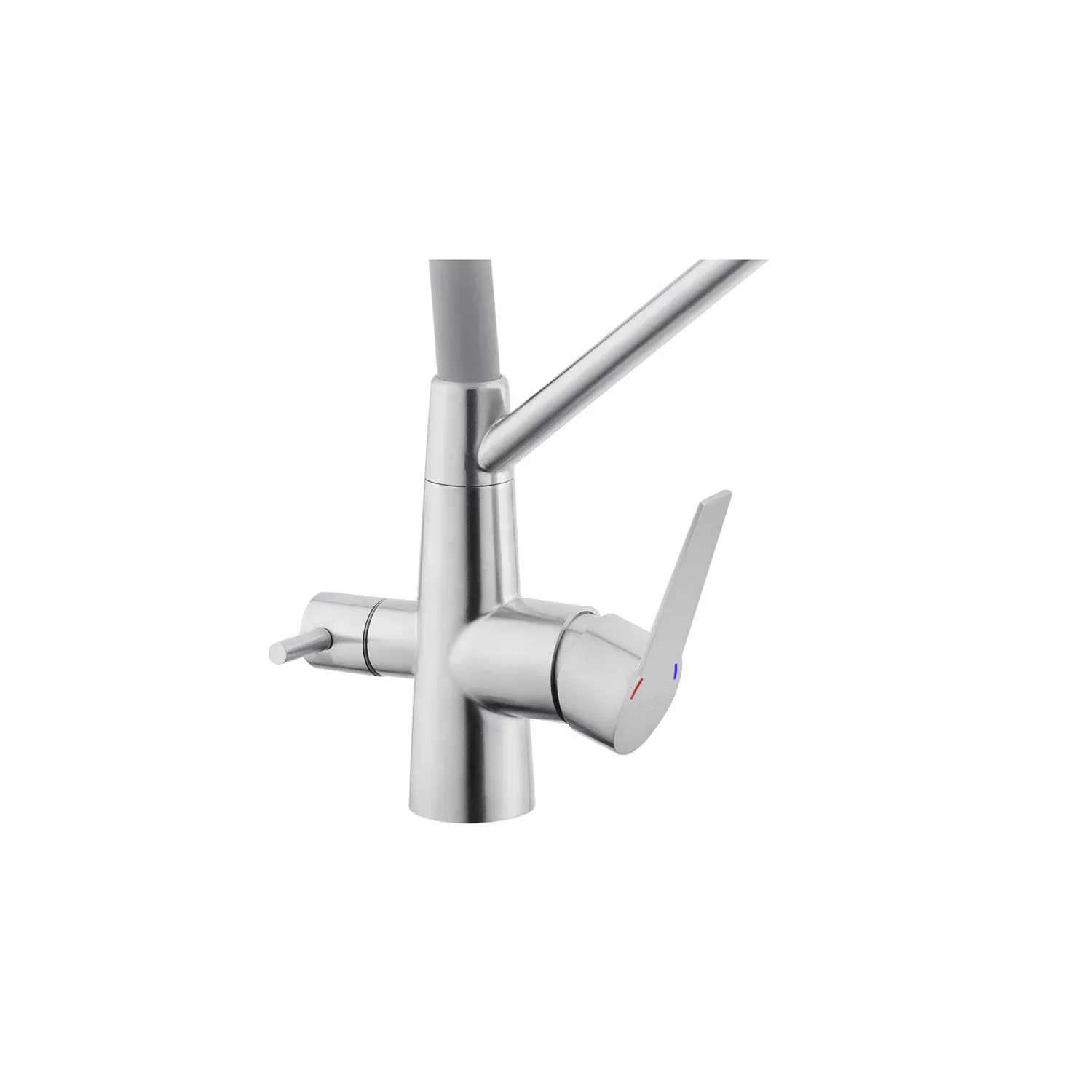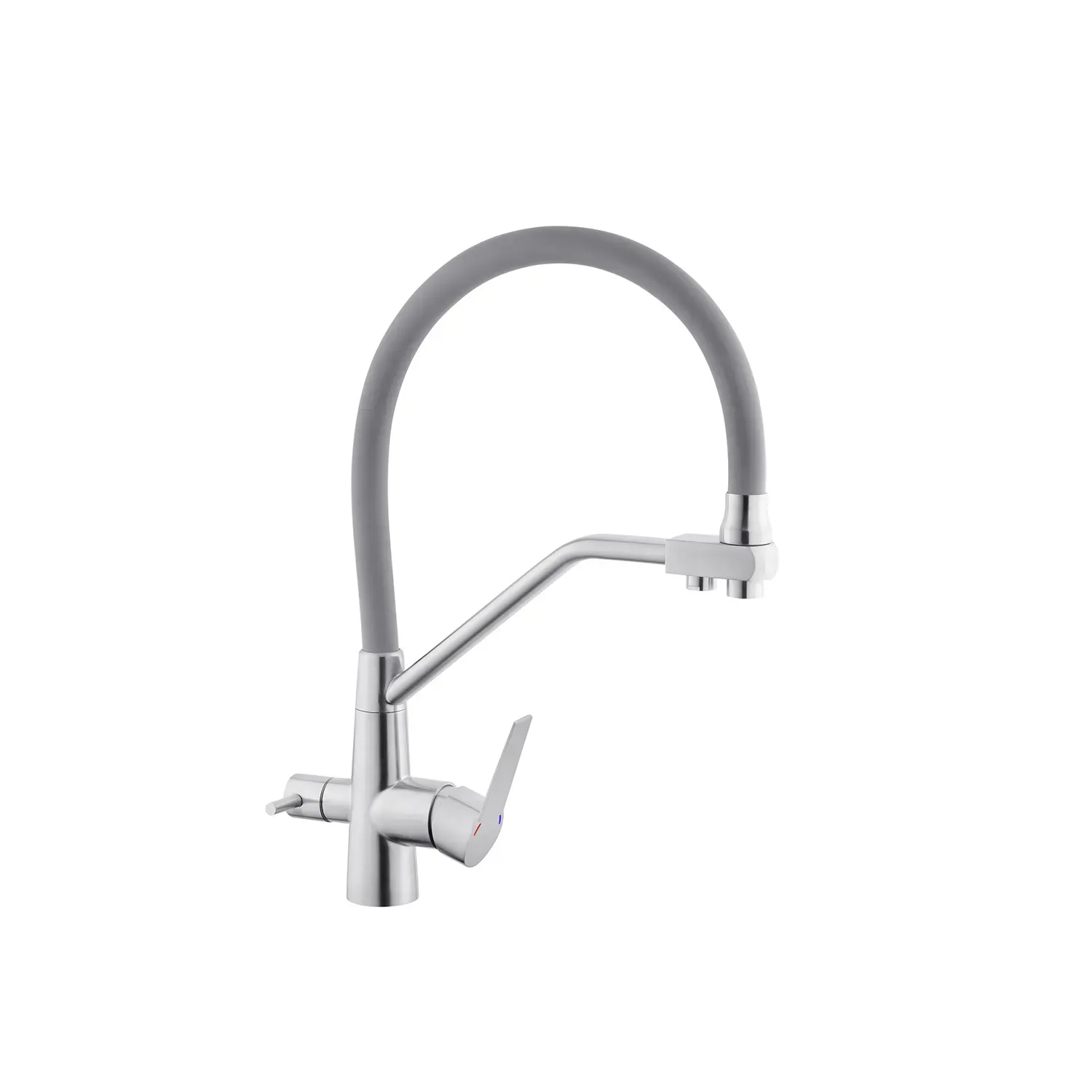 Змішувач для кухні з підключенням до фільтру Kroner KRP Edelstahl Klassisch - ESG03817GRA виготовлений з високоякісної нержавіючої сталі, яка не піддається корозії, стійка до ударів та появи тріщин. Змішувач має U-подібну форму з трьома контурами підключення води. За участю першого та другого здійснюється підключення холодної та гарячої води, де змішування відбувається за допомогою картриджа.