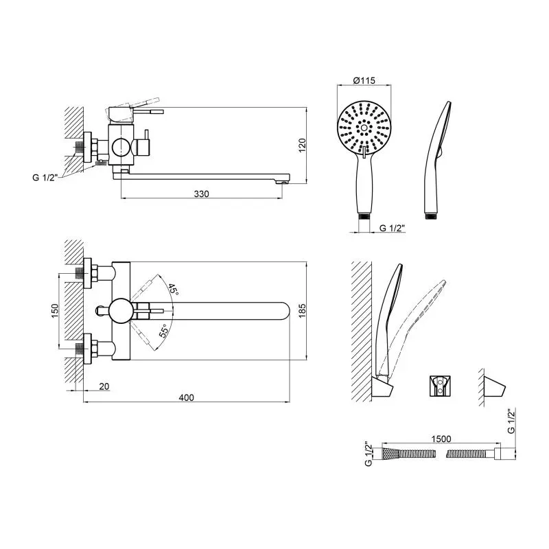 Змішувач для ванни lidz aria 005 з поворотним виливом (з душовим гарнітуром) (k35) ldari005bla43368
