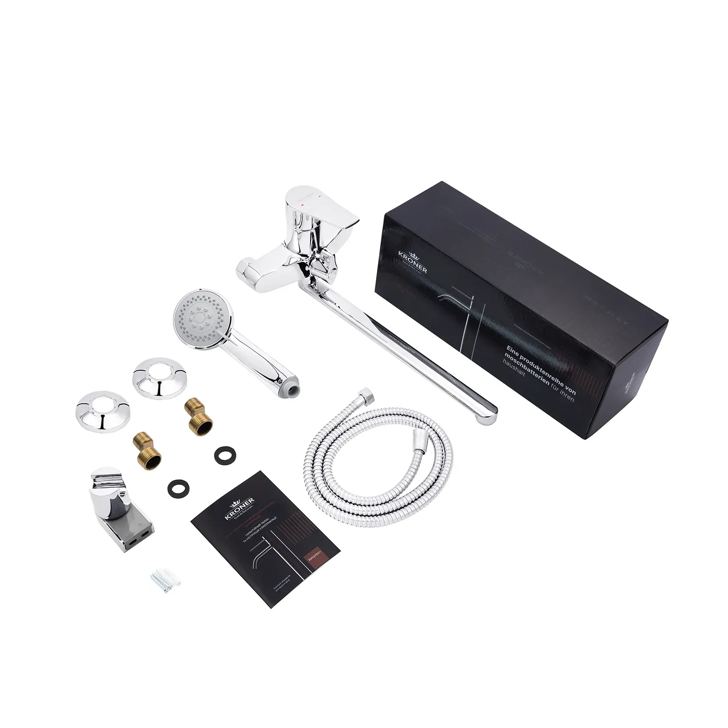 Призначений спеціально для ванни, змішувач Kroner KRP Enzo - C070 легко монтується на стіні, забезпечуючи чистий і організований вигляд простору. Виготовлений з високоякісної латуні, забезпечує міцність і довговічність використання. Механізм змішування на основі картриджа дозволяє плавно регулювати температуру води. Глянцева поверхня та елегантна кругла форма лійки додають шарму і привабливості. Змішувач Kroner забезпечить комфорт і задоволення під час кожного користування.