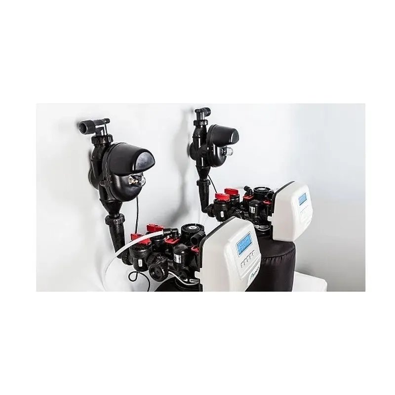 На выходной линии каждого фильтра устанавливается автоматический двухходового клапан, перекрывающий подачу исходной воды потребителю. Для подключения клапана к управляющему клапану фильтра используется сигнальный кабель (он же и питает). Когда начинается регенерация, управляющий клапан фильтра переключает клапан перекрытия байпаса в закрытое состояние. После окончания промывки - двухходовой клапан переходит в исходное открытое состояние.