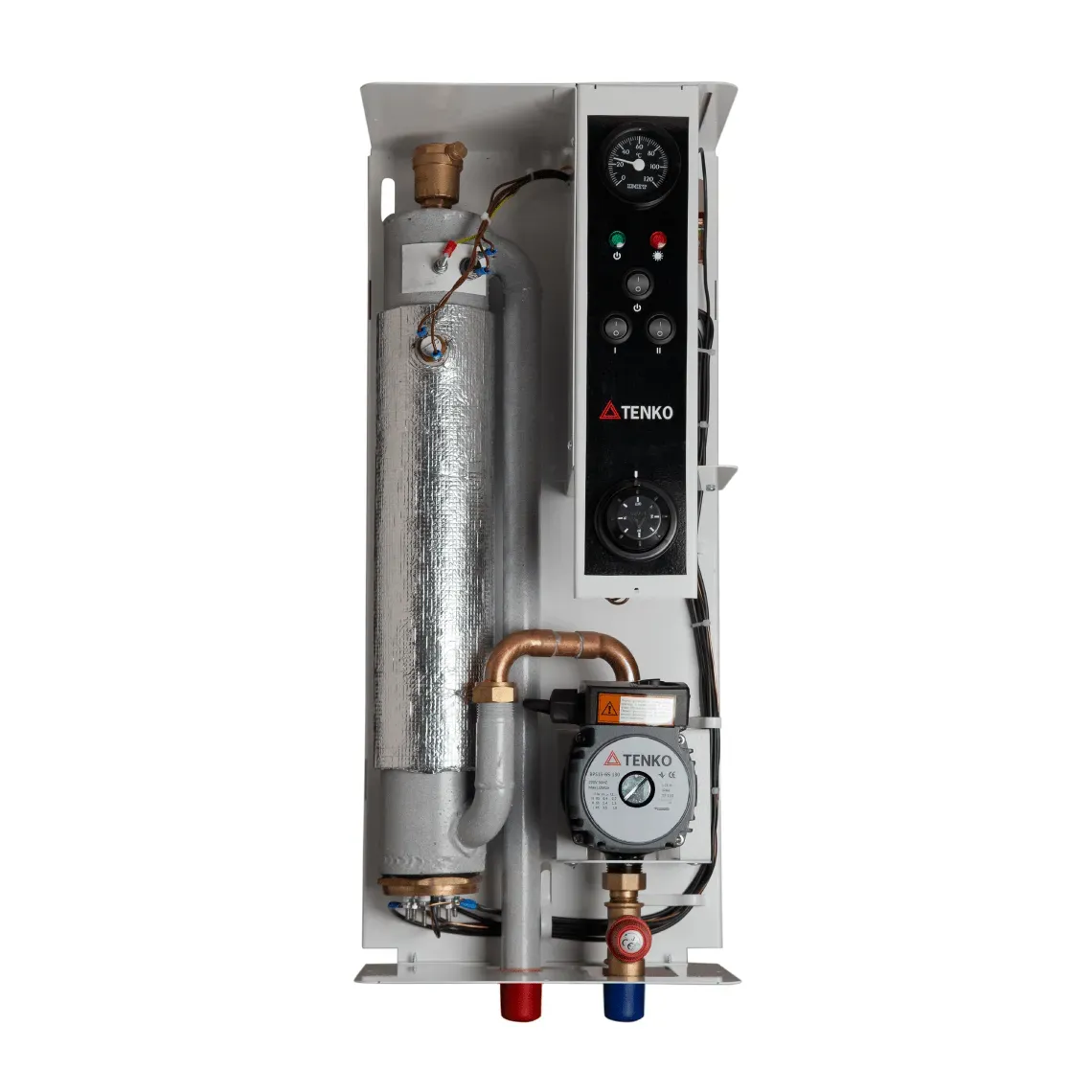 Корпус котла сделан из высококачественной стали отечественного производства и подвергнут антикоррозионной обработке. Для придания ему дополнительных защитных свойств и элегантного внешнего вида применяется порошковая технология покраски. Теплообменник выполнен из качественной стальной толстостенной трубы ведущего в своей отрасли отечественного предприятия. Для увеличения срока эксплуатации каждый теплообменник подвергается специальной антикоррозийной обработке и проходит гидравлические испытания на давление 8 бар. Гидравлическая группа, собранная при помощи надежных латунных соединений и фитингов, прошла совместно с теплообменником испытания на герметичность при давлении 3 атмосферы. Поставка электрических котлов ТМ Tenko осуществляется в фирменной картонной упаковке. Также в комплект поставки входит руководство по монтажу и эксплуатации.