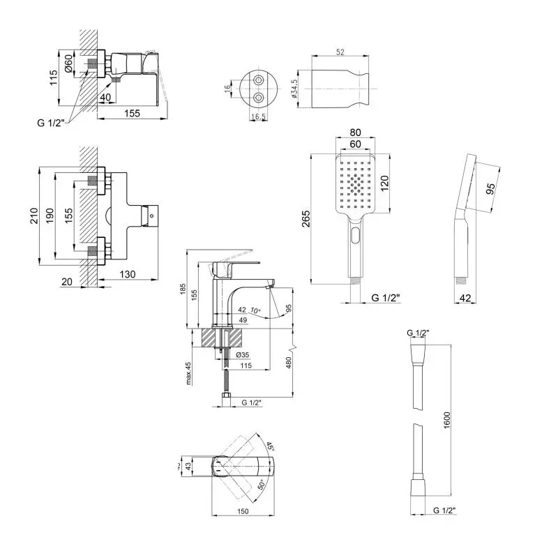 1,74 смеситель для раковины; 1,54 – смеситель для душа; 0,263 – лейка; 0,39 – шланг; 0,047 – держатель