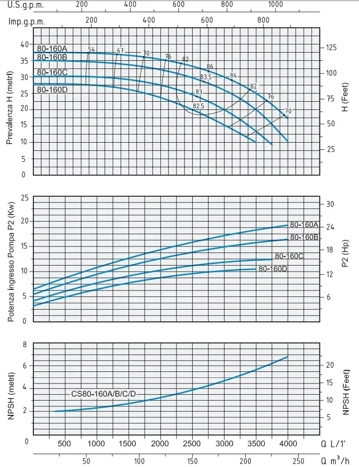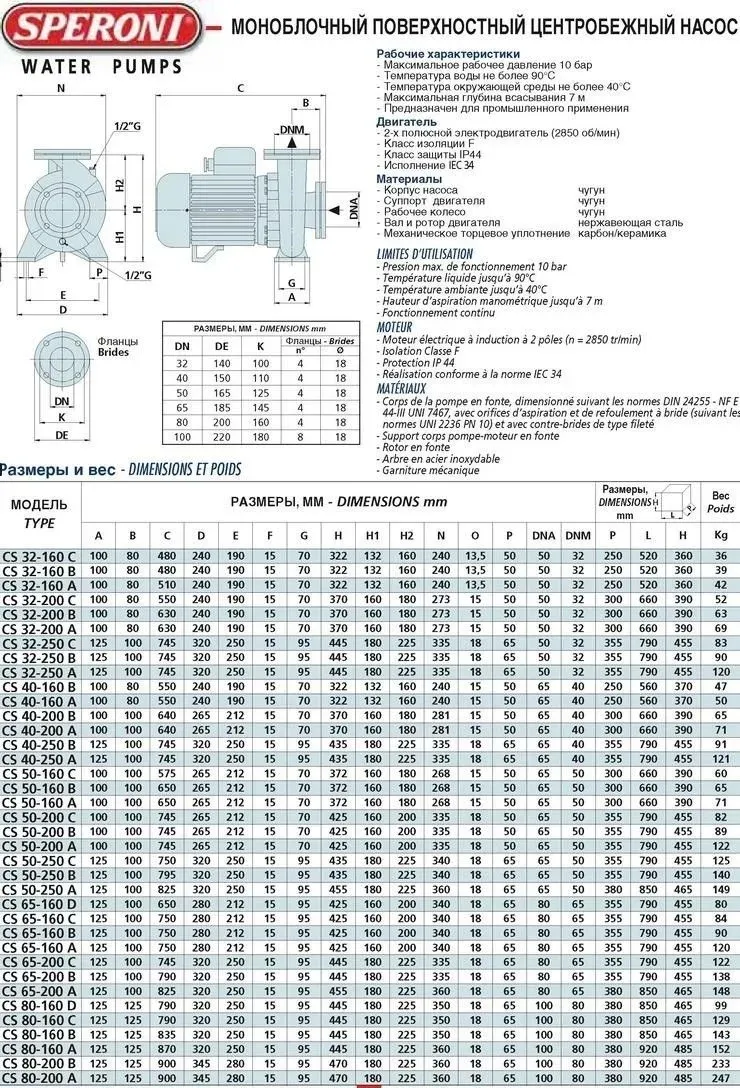 Центробежные моноблочные одноступенчатые электронасосы Speroni CS изготовленны по DIN 24255 - NFE44-II - UNI 7467 стандартам. Соединение насоса и двигателя осуществляется через промежуточный фланец. Такой тип насоса идеален для перекачивания чистой воды и других химически и механически не агрессивных жидкостей. Если предполагается перекачивать жидкость, плотность или вязкость которой отличается от тех же параметров воды, то вследствие изменения гидравлической мощности необходимо учитывать потребную в этом случае мощность электродвигателя..