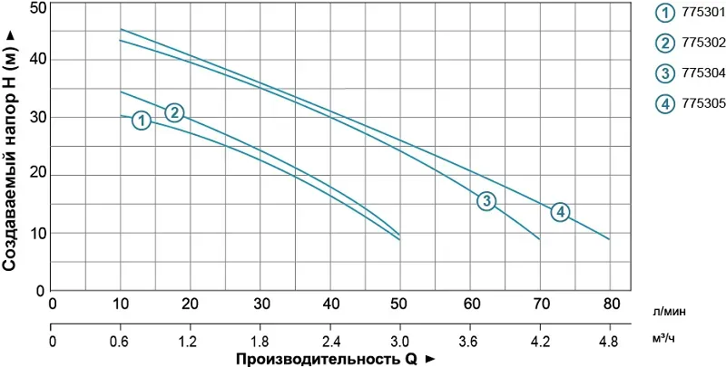 При сравнительно небольшой мощности потребления обеспечивает высоту подъема до 43 м. Объем прокачивания – 4,2 м³/час. Максимальное расстояние от насоса до поверхности воды (глубина всасывания) – 8 м. Масса – 9,75 кг.