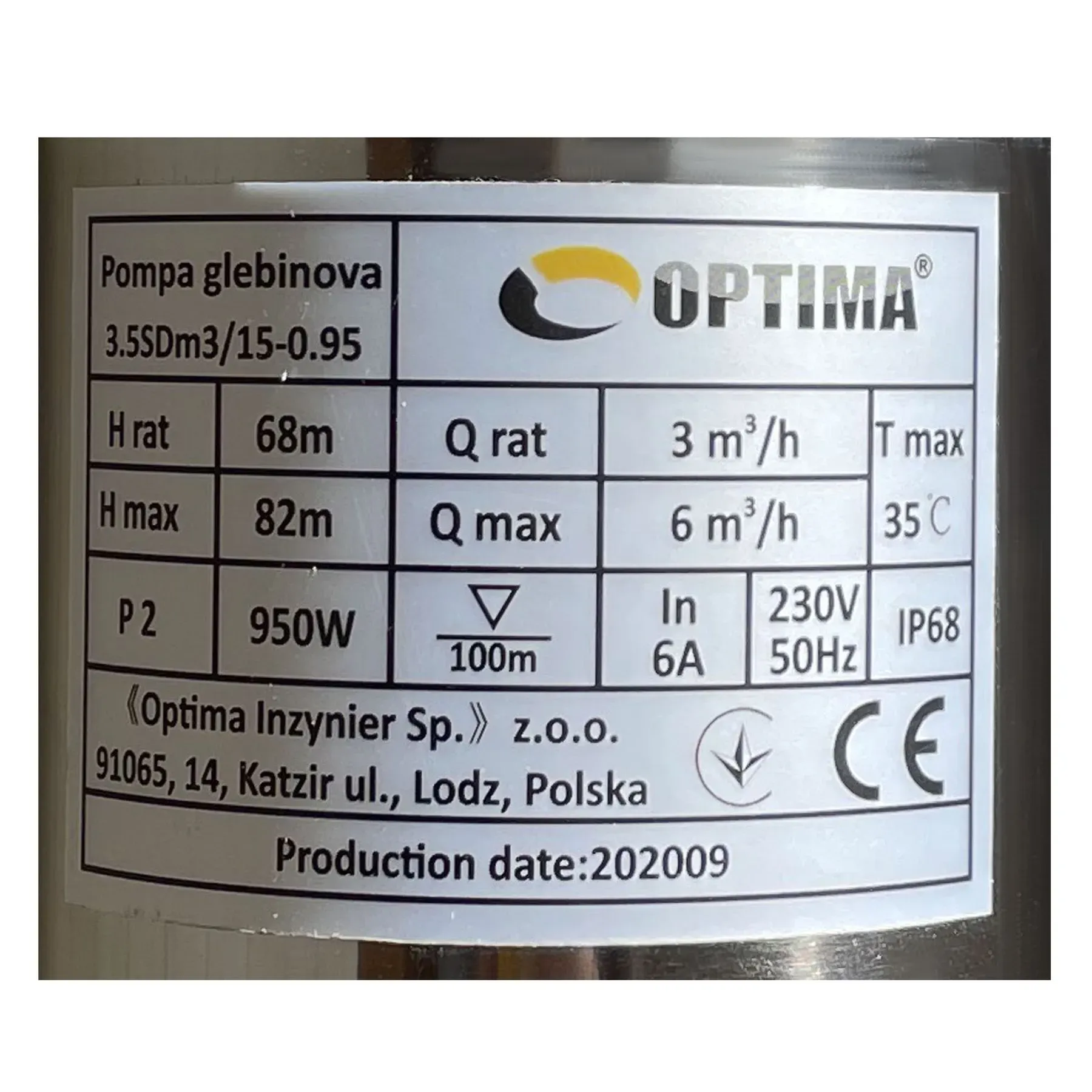 Насос OPTIMA 3.5SDm3/15 0.95 кВт 82м состоит из двух частей: двигатель в нижней части и насос в верхней части, жестко соединены между собой зубчатой муфтой международного стандарта Nema и имеет забор воды в средней части корпуса. Насос относятится к насосам центробежного типа и имеет многоступенчатую конструкцию и «плавающие» рабочие колеса, благодаря которым реализуется повышенная устойчивость к песку (до 1500 г / м3).