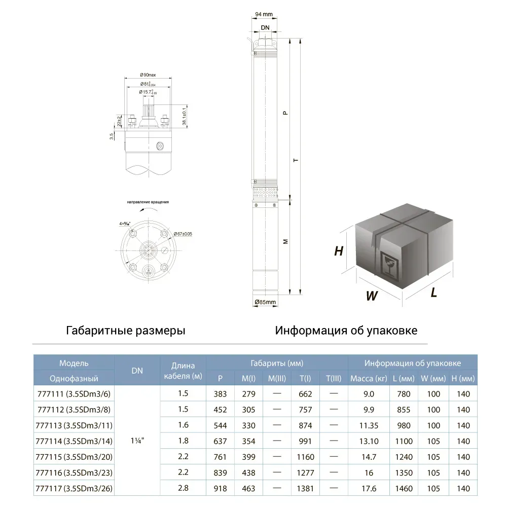 Производительность – 80 л/мин, высота подъема – 61 м, минимальный диаметр скважины – 113 мм, мощность – 0,55 кВт.