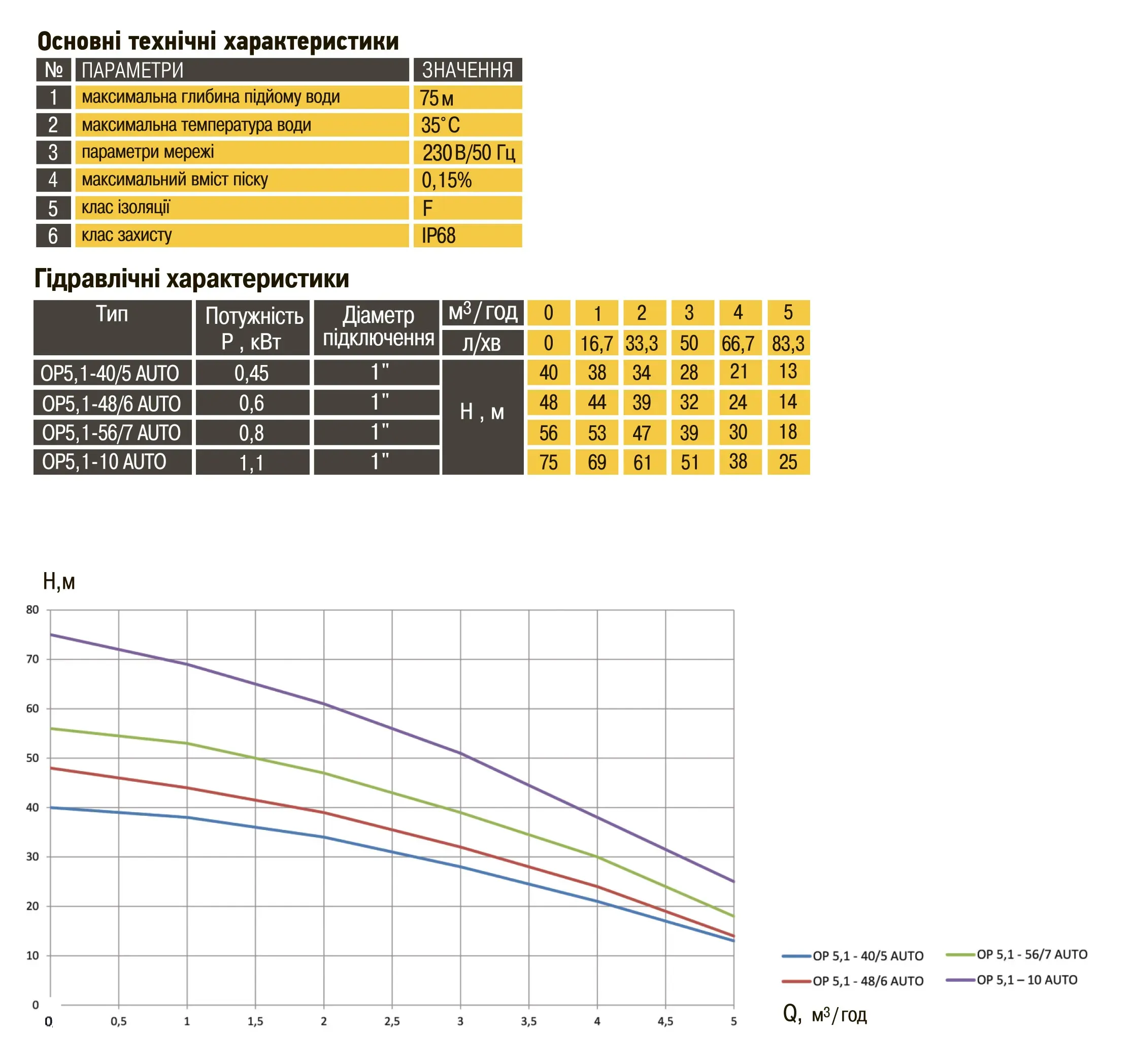OPTIMA OP 5,1 - 48/6 AUTO 0,6 кВт оснащен асинхронным однофазными двигателем с коротко замкнутым ротором . Двигатель заполнен специальным минеральным маслом для эффективного охлаждения (теплоотдачи в окружающую среду), а также для смазки и охлаждения подшипников и механического уплотнения.