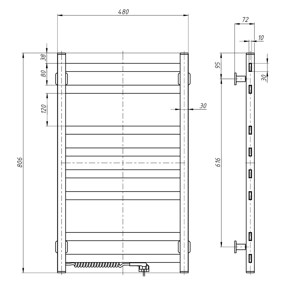 Электрическое полотенцесушитель Авангард, коллекторы которого выполнены из профильной квадратной трубы 30х30 мм, а перемычки из прямоугольных трубок 30х10мм. Что придает ему монументальность, однозначность формы. Прямые линии, четкие углы в сочетании с квадратным профилем образуют модный ныне дизайн строгих геометрических форм без компромиссов. обладает высокой антикоррозионной стойкостью. Толщина стенки перемычек полотенцесушителя составляет 1,5, а стоек 2 мм. Сушилка имеет зеркальную полированную поверхность, полученную путем высокоточной электроплазменной полировки.