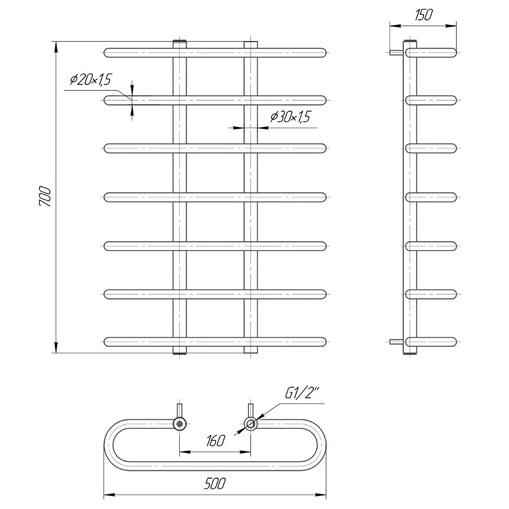 Диаметр: стойка Ø30, толщина 1,5 мм; перемычка Ø20, толщина 1,5 мм