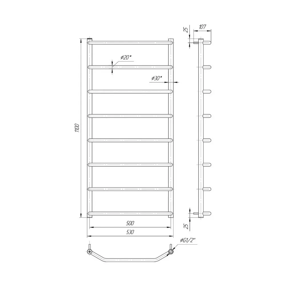 Диаметр: стойка Ø30, толщина 2мм; перемычка Ø20, толщина 1,5 мм