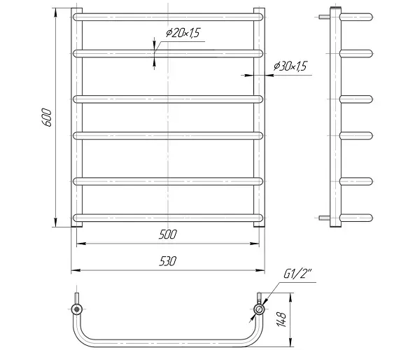 Диаметр: стойка Ø30, толщина 1,5 мм; перемычка Ø20, толщина 1,5 мм