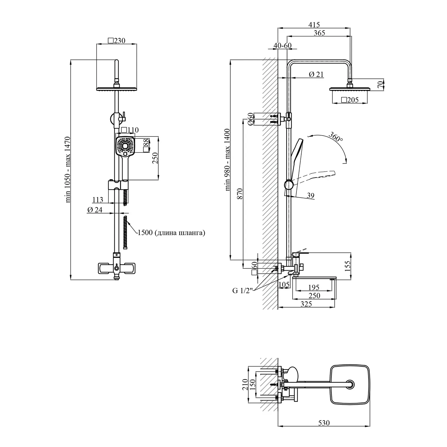 Высота душевой стойки: Минимальная – 1050 мм, максимальная – 1470 мм.