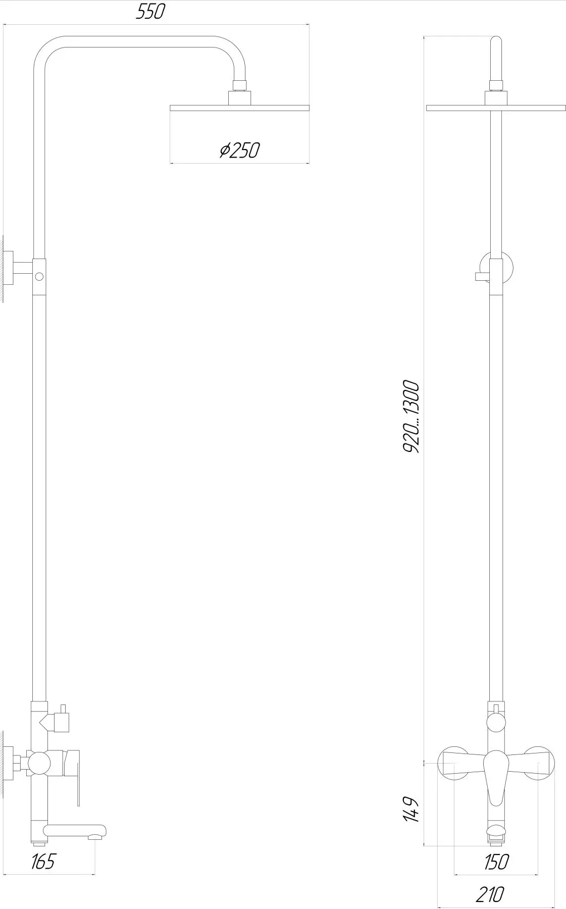 - верхний душ – круглая воронка ø 25 см, стойка (85-125 см)