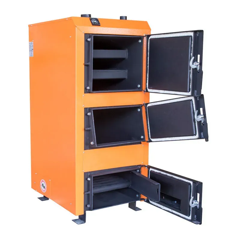 Твердотопливный котел длительного горения который работает на любом твердом топливе (антрацит, уголь, брикет, торф, дрова) и автоматически поддерживает температуру теплоносителя, заданную с помощью электронного регулятора температуры.