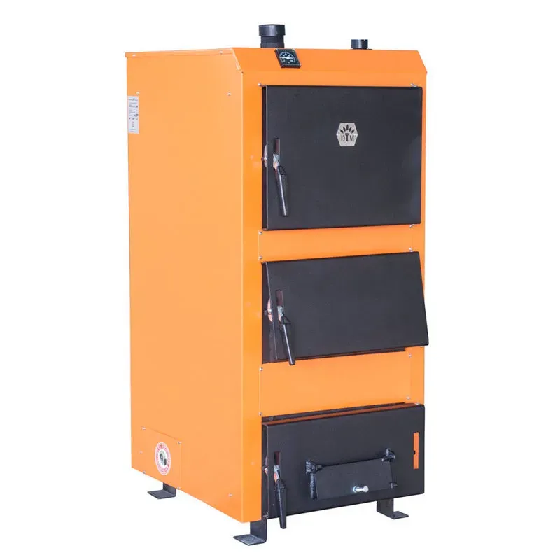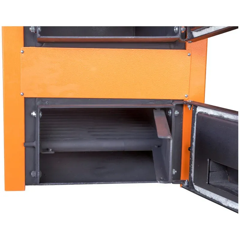 Увеличена камера сгорания и большие загрузочные дверцы позволяют загружать дрова (топливо) большого диаметра. Котел может работать как на нижнем так и на верхнем горении, благодаря наличию горизонтальных шиберов (заслонок). С их помощью точно дозируется подача воздуха в необходимую часть камеры сгорания. Регулируемые ножки позволяют игнорировать неровности напольного покрытия и поставить котел на любой поверхности ровно. Трубчатый теплообменник, конструктивная особенность котла ДТМ Универсал позволяет быстрее нагревать теплоноситель (воду). А это значит, что Ваша система отопления прогреется быстрее. В производстве котла DTM используется сертифицированная сталь, разработанная специально чтобы работать под давлением.
