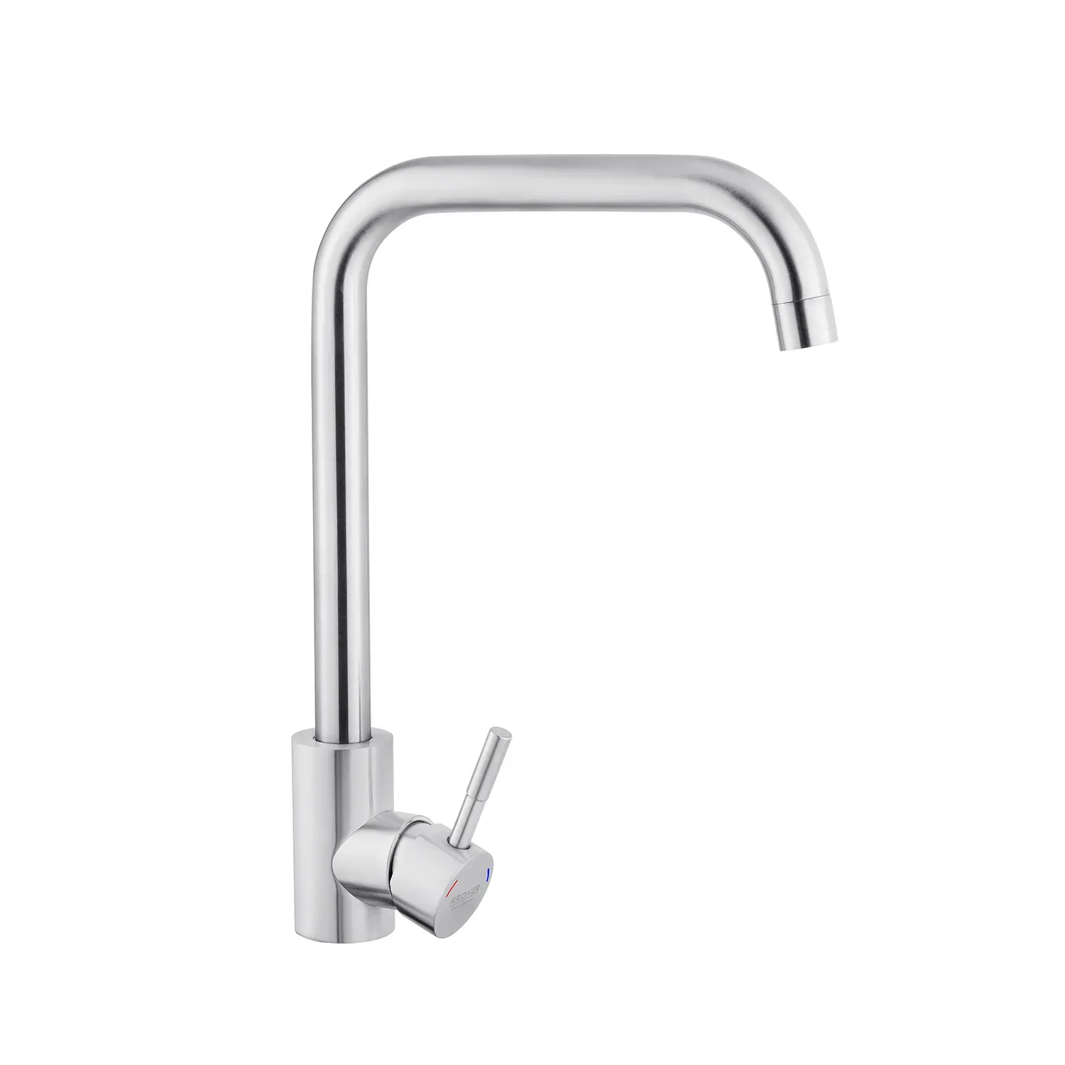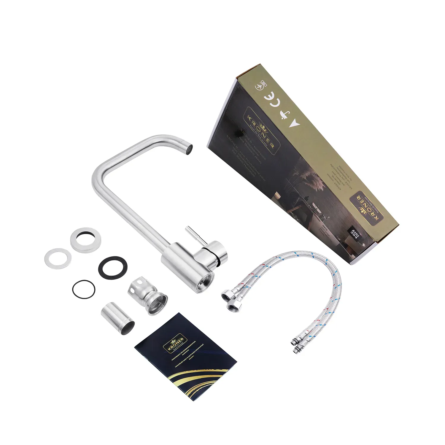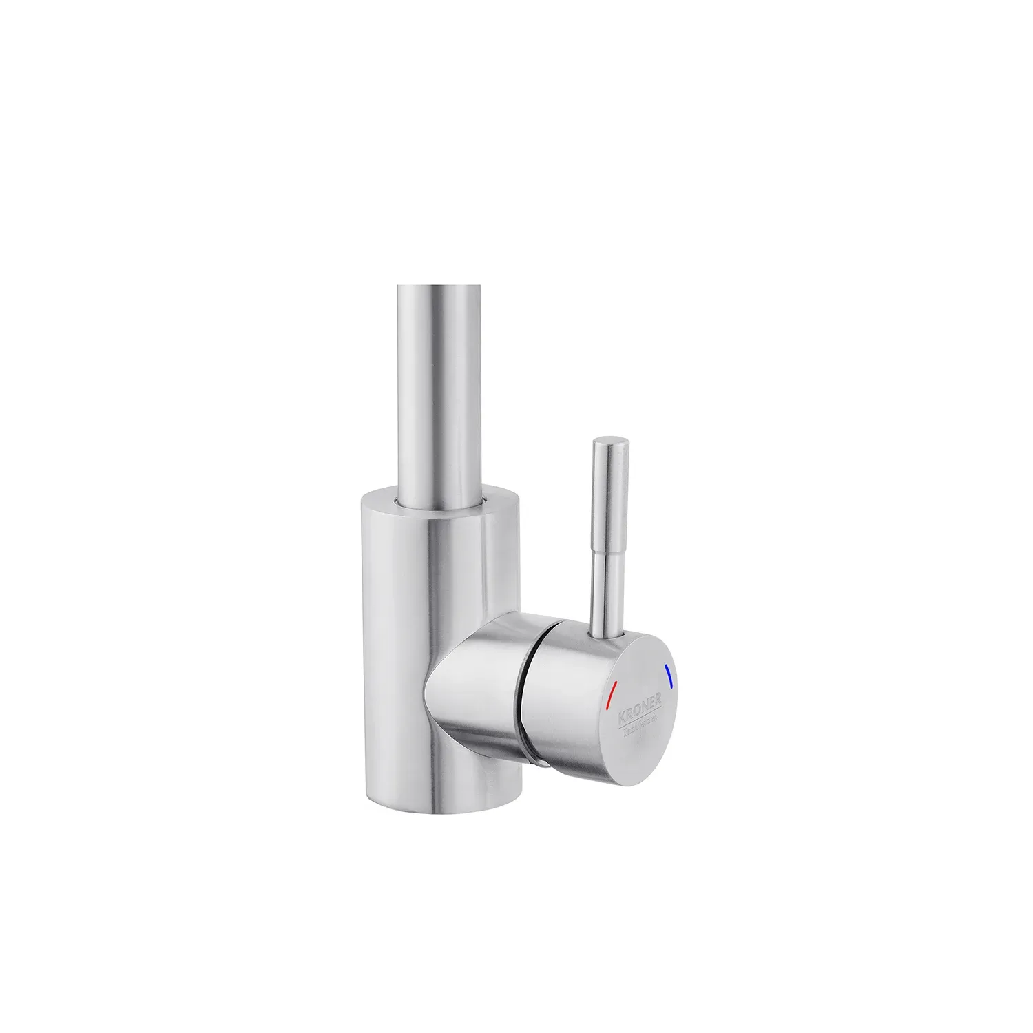 Кухонные смесители Kroner – это немецкое качество, технология и надежность. Современный дизайн станет успешным дополнением интерьера кухни. Изготовление из качественных материалов, не поддающихся коррозии, легкость в сборке не доставит хлопот при монтаже и использовании. Имеют поворотное излияние и устанавливается на одно отверстие с подводом воды с помощью гибких шлангов М10х1/2". Шланги для подключения входят в комплект. Данная модель изготовлена из нержавеющей стали AISI 304.